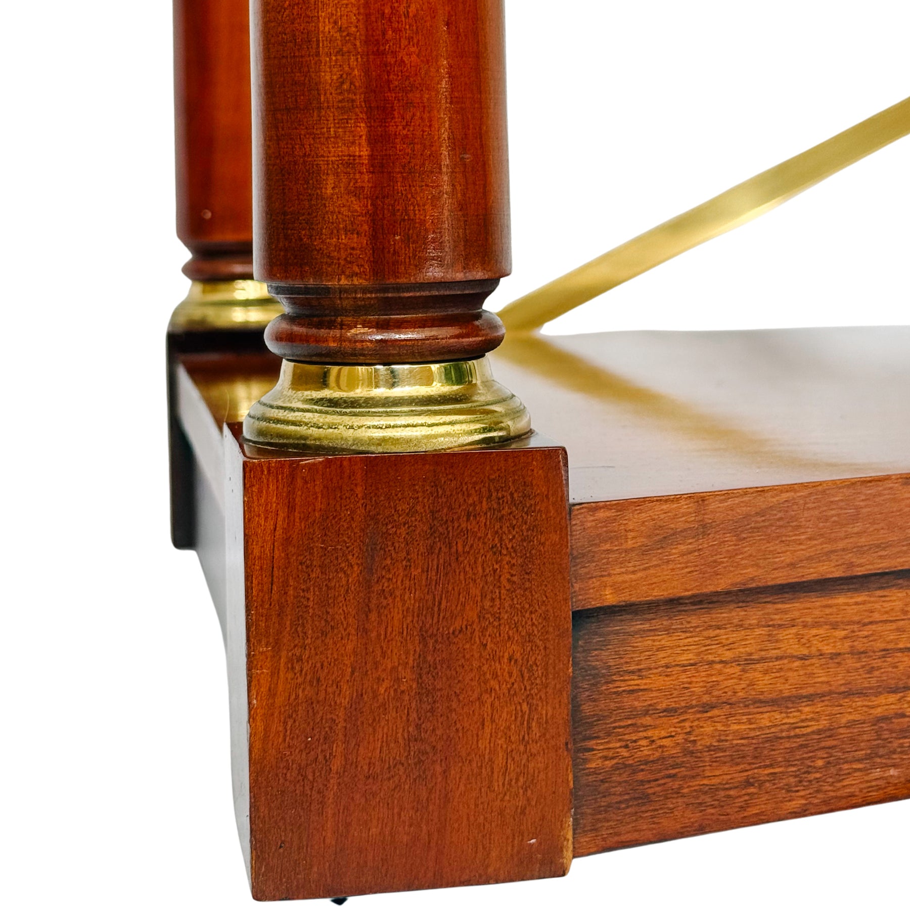 Made in a rich cherry finish and featuring columnar legs fitted with decorative brass caps at the top and base and a single drawer with solid brass ring pulls in a classical medallion motif.