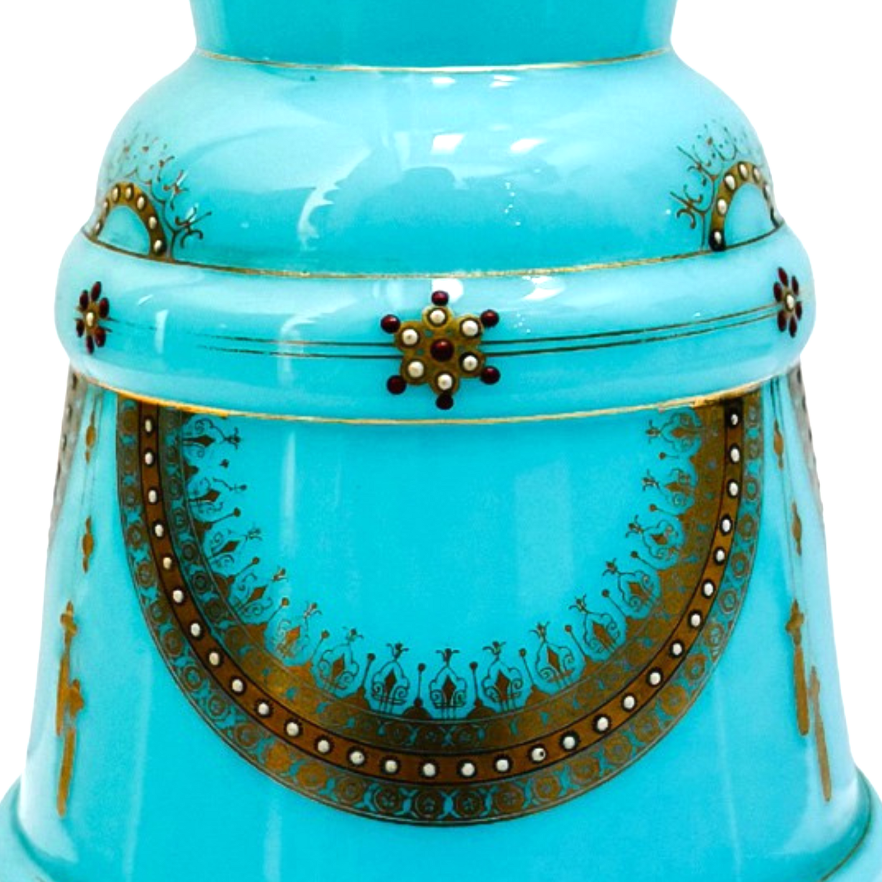 Antique 19th Century French Blue Celeste Opaline Glass Vase With Hand-Painted Jeweled Enamel