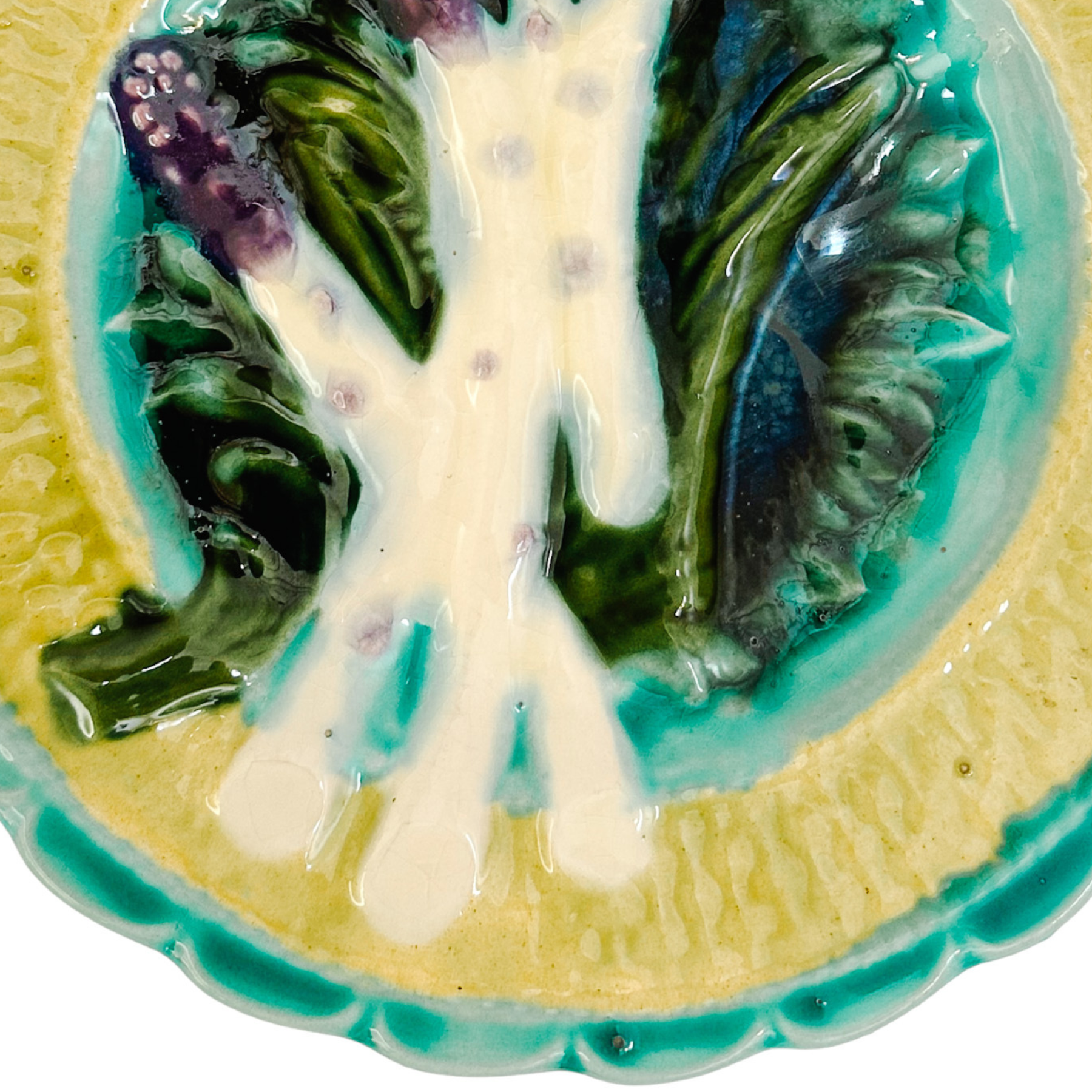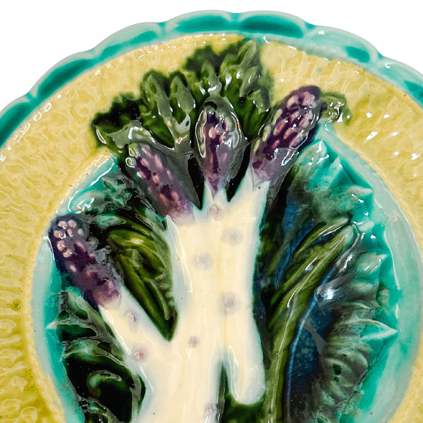 A 19th Century French faience asparagus plate from the Salins-les-Bains region of France. In typical French barbotine majolica fashion, this plate is richly colored and embossed with four purple head asparagus spears resting on a bed of leafy greens and against a turquoise background. A beautiful soft yellow basket weave is painted around the blue scalloped edges. Has a shallow sauce well indentation for sauce.