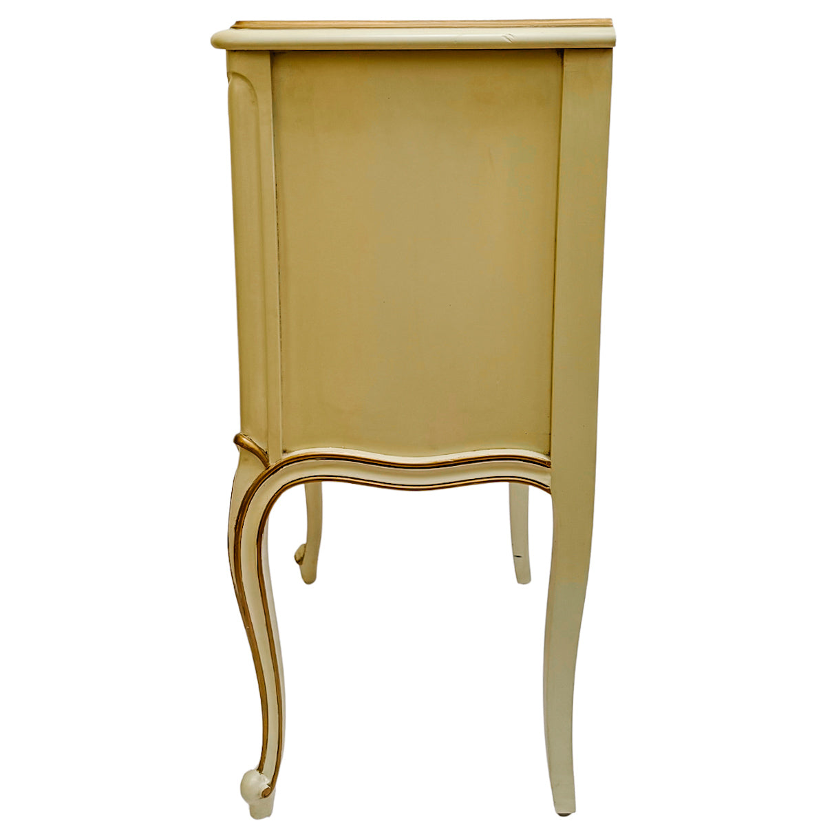 Pair of 1950s American-made French Provincial Louis XV style nightstands by Drexel from the celebrated Touraine collection. These were custom-made and feature a quintessential distressed French style crème peinte (painted cream)—a soft, creamy ivory enamel that contrasts beautifully with the hand-applied gold trim that traces the elegant cabriole legs and flowing outlines.
