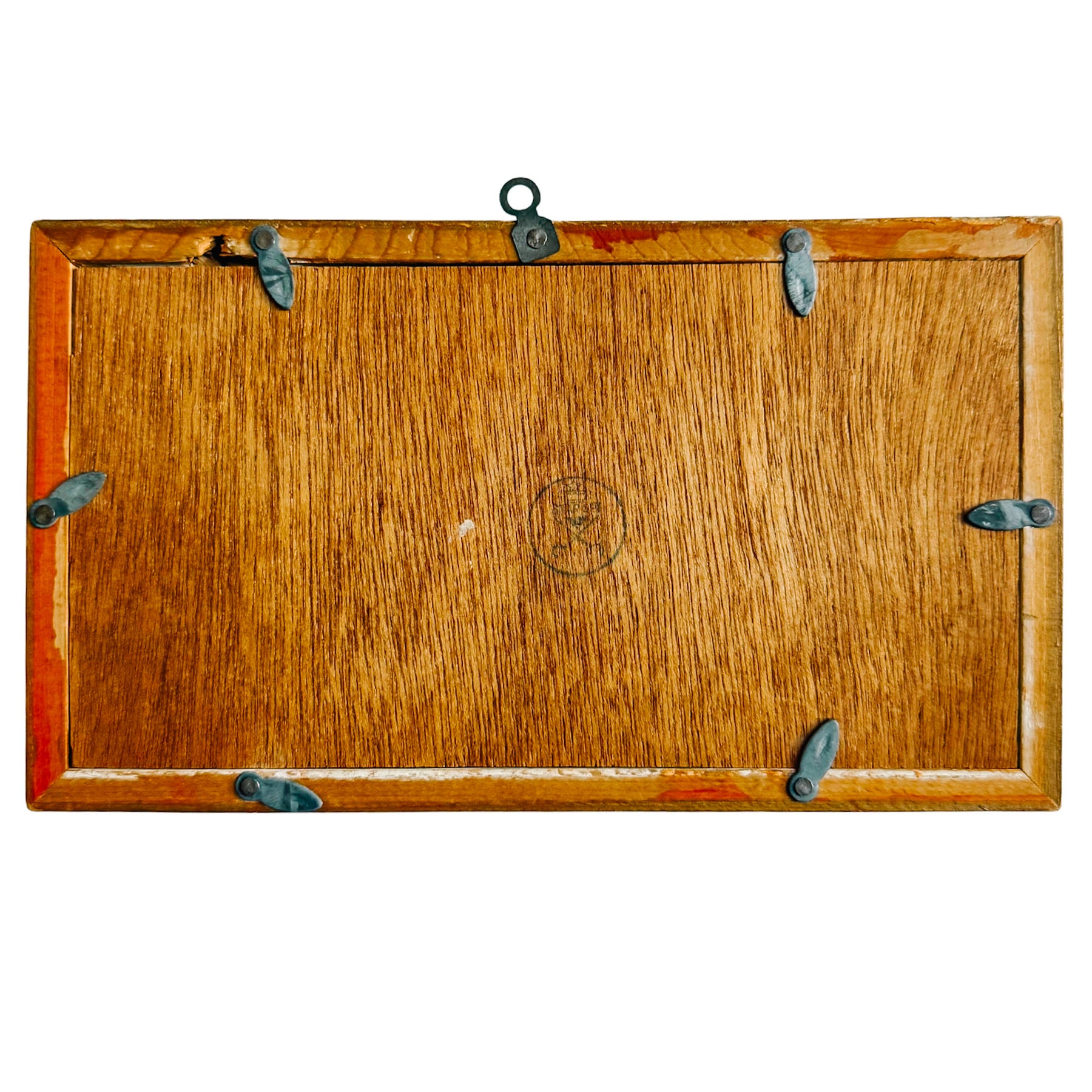Transport yourself to the heart of 1960s or 70s Paris with this vintage framed set of two hand-painted ceramic tiles capturing two iconic Parisian scenes in a bright, mid-century folk art style.