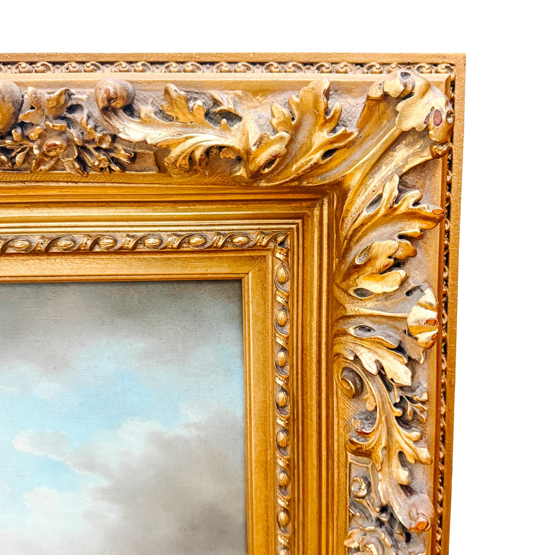 The painting is housed in an exceptionally deep (4.5") giltwood frame. The frame features intricate pierced scrolling acanthus leaves and floral motifs, adding a layer of architectural grandeur to the piece. The rich gold finish provides a warm, luminous glow that perfectly complements the soft, ethereal light of the sky. Signed by the artist Humphrey (bottom right).