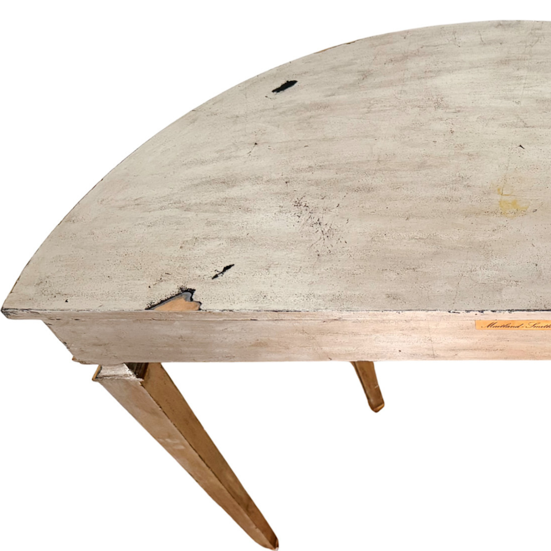 A sophisticated demilune console table by Maitland-Smith, featuring a Neoclassical silhouette and hand-applied distressed metallic finishes. This high-end accent piece is designed with a flat back, making it ideal for entryways, hallways, or narrow living spaces. Hand-applied silver leaf with a soft, aged patina and contrasting gilded (gold leaf) accents. Features a central floral medallion on a scalloped apron, flanked by scrolling acanthus carvings. Three square-tapered legs detailed with carved husk garlands and block capitals. Includes the original Maitland-Smith brass nameplate and "Handmade in Philippines" sticker.