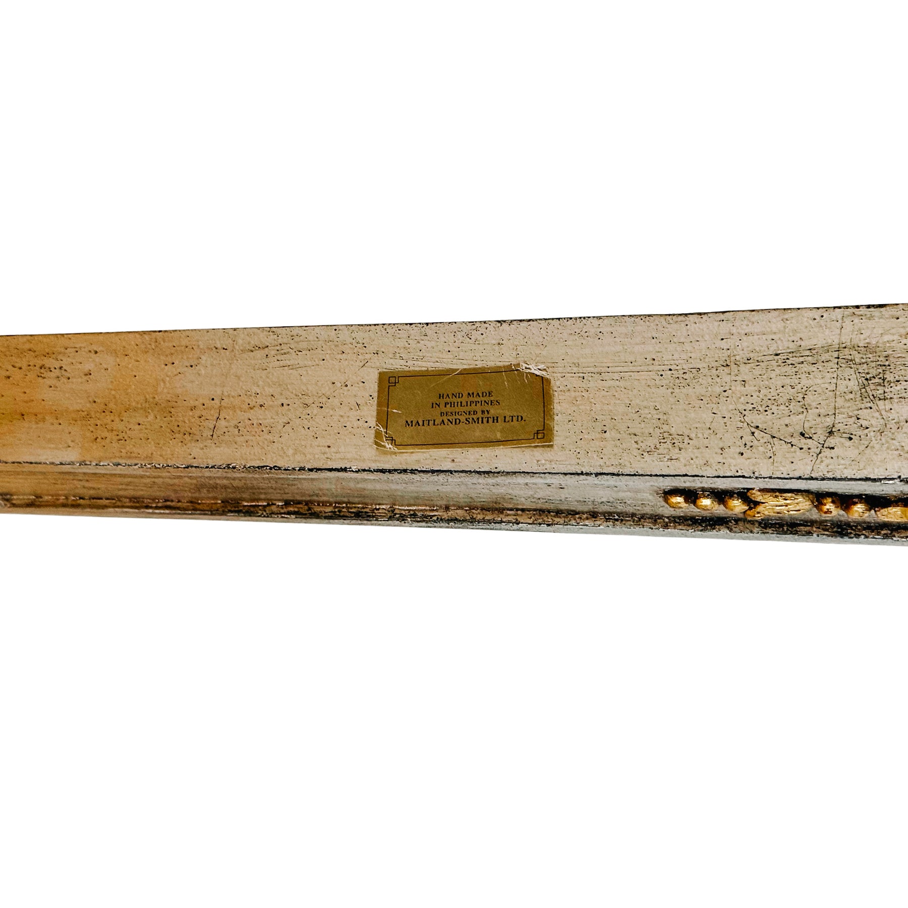 Great condition with intentional distressed patina. A few notable areas of wear to the silver leafing are present on the front rim and the top back edge (see photos). These marks are consistent with genuine silver leaf furniture and blend in effortlessly with the original intentional distressed finish.
