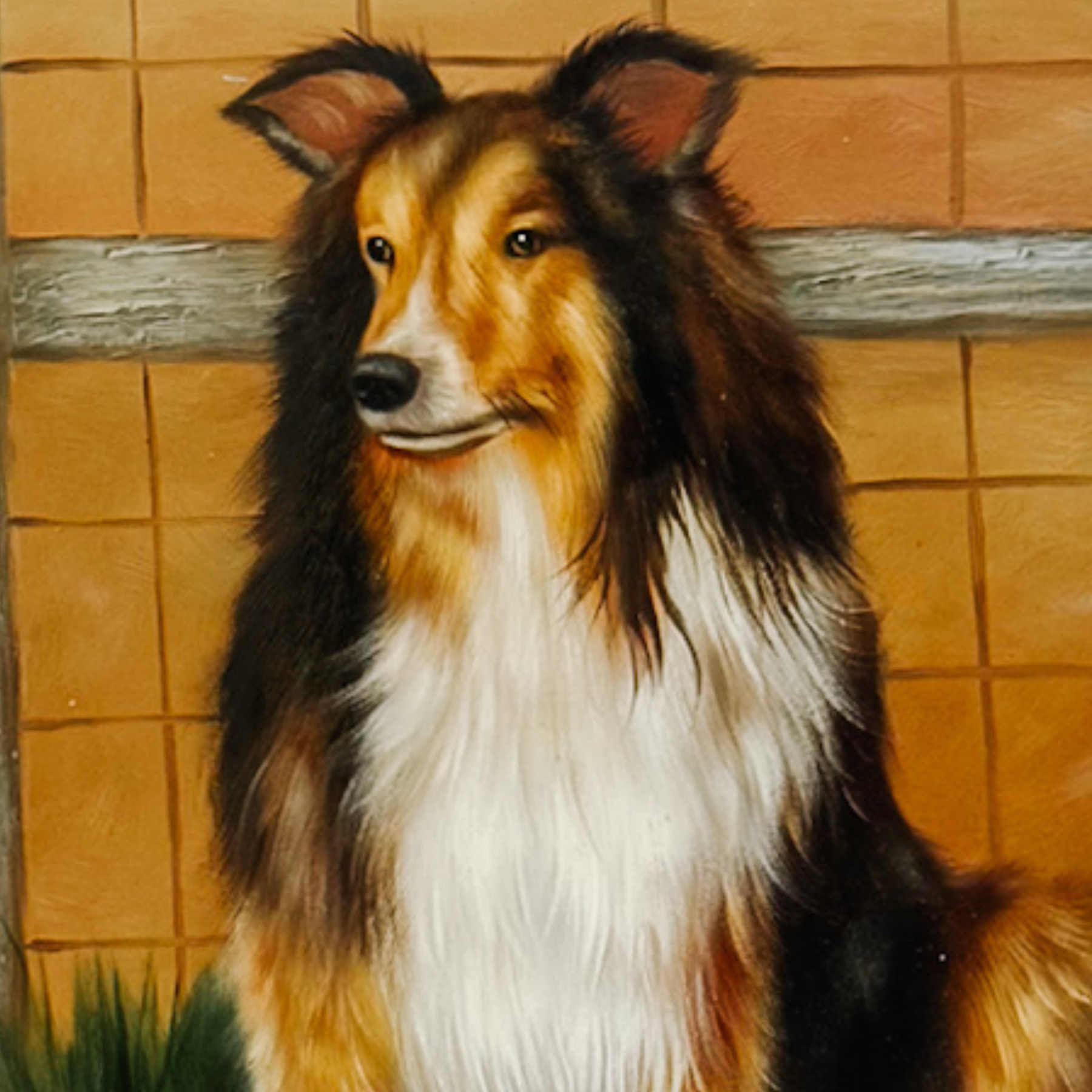 A vintage oil painting on board featuring a noble Rough Collie (Shetland Sheepdog) in a dignified seated pose. The artist has skillfully rendered the dog’s lush, tri-color coat and attentive expression, set against a warm, architectural background with a classic fence and tile motif.