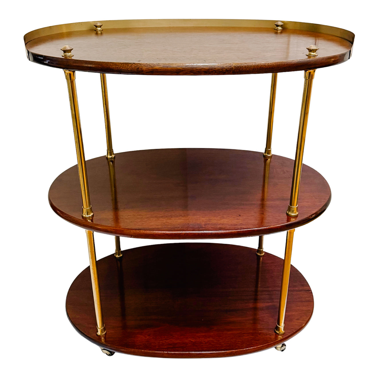 A elegant and functional three-tier rolling cart, perfect for serving cocktails, afternoon tea, or as a striking side table. This piece embodies the glamour of the Mid-Century Modern and Hollywood Regency styles, likely dating from the 1950s or 1960s. It features three beautifully proportioned oval tiers finished in a rich, dark mahogany (or similar rich hardwood). The warm wood is perfectly complemented by the slender polished brass tubular supports and finials.