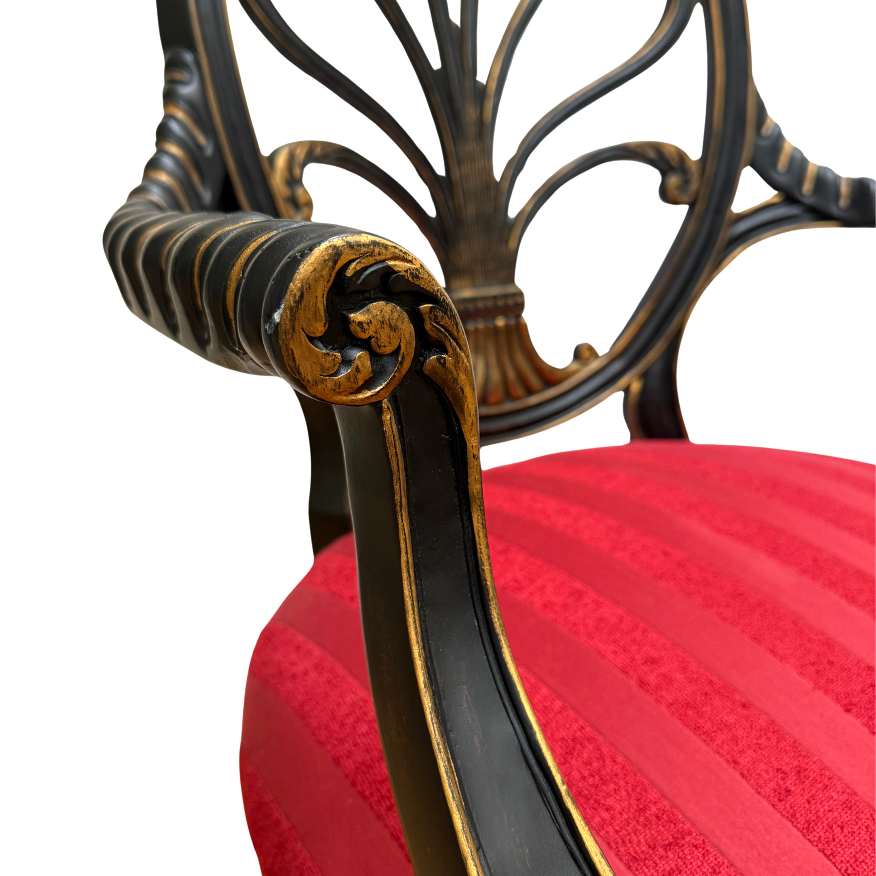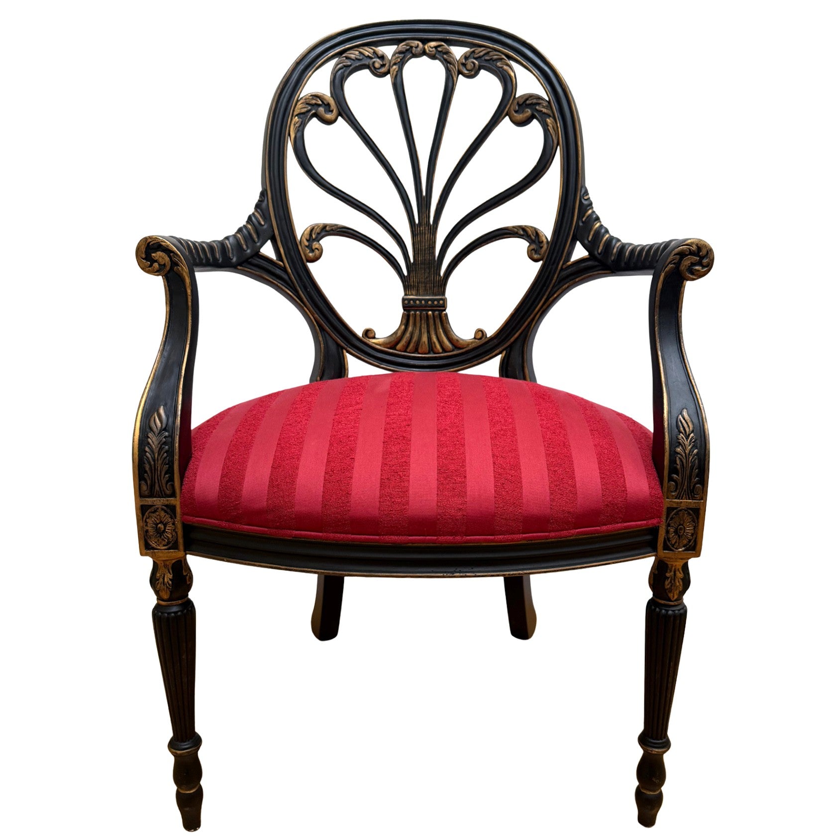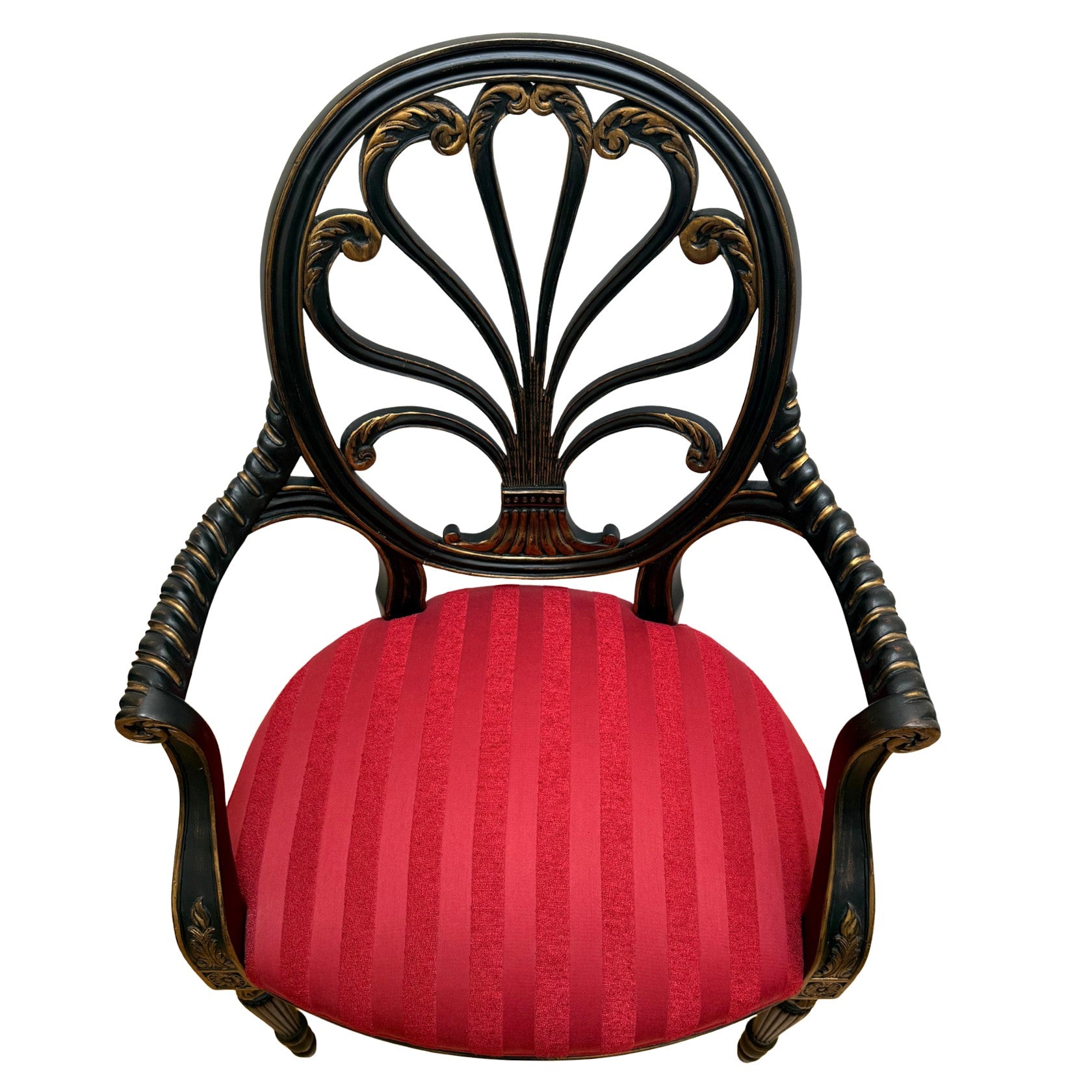 They retain their original upholstery in a vibrant red striped fabric (likely a velvet or damask blend), offering a striking color contrast to the ebonized frame. The fabric is described on the original tag as "Red/Gold Stripe."