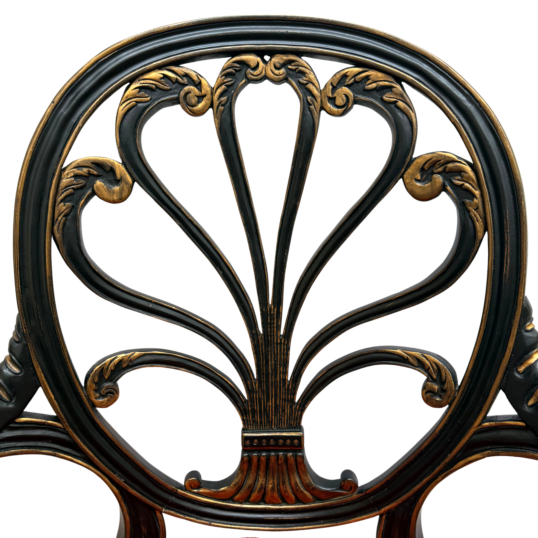The frames are finished in a striking Antiqued Black lacquer, richly accented with gold gilt detailing on the carvings and legs. The distinctive anthemion splat back features a stylized fan or lyre shape, a hallmark of classical design that gives the chair its formal, airy appeal. Details include carved rosettes on the seat rails, delicate fluting on the tapered front legs, and ornate roping on the arms.