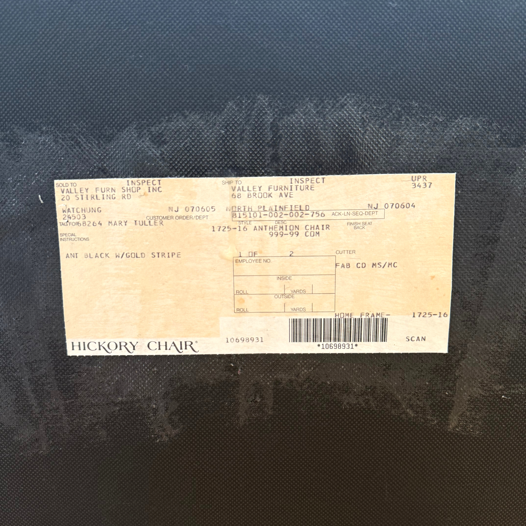 Pair of vintage armchairs by Hickory Chair Company capturing the drama of the Neoclassical style and drawing inspiration from the English Regency and American Federal periods. The style name was called Anthemion, and the standard came in a medium mahogany but this pair was custom-made in antique black and gold (original custom order details still on the bottom).