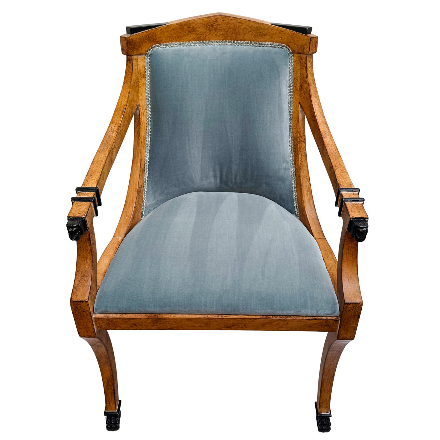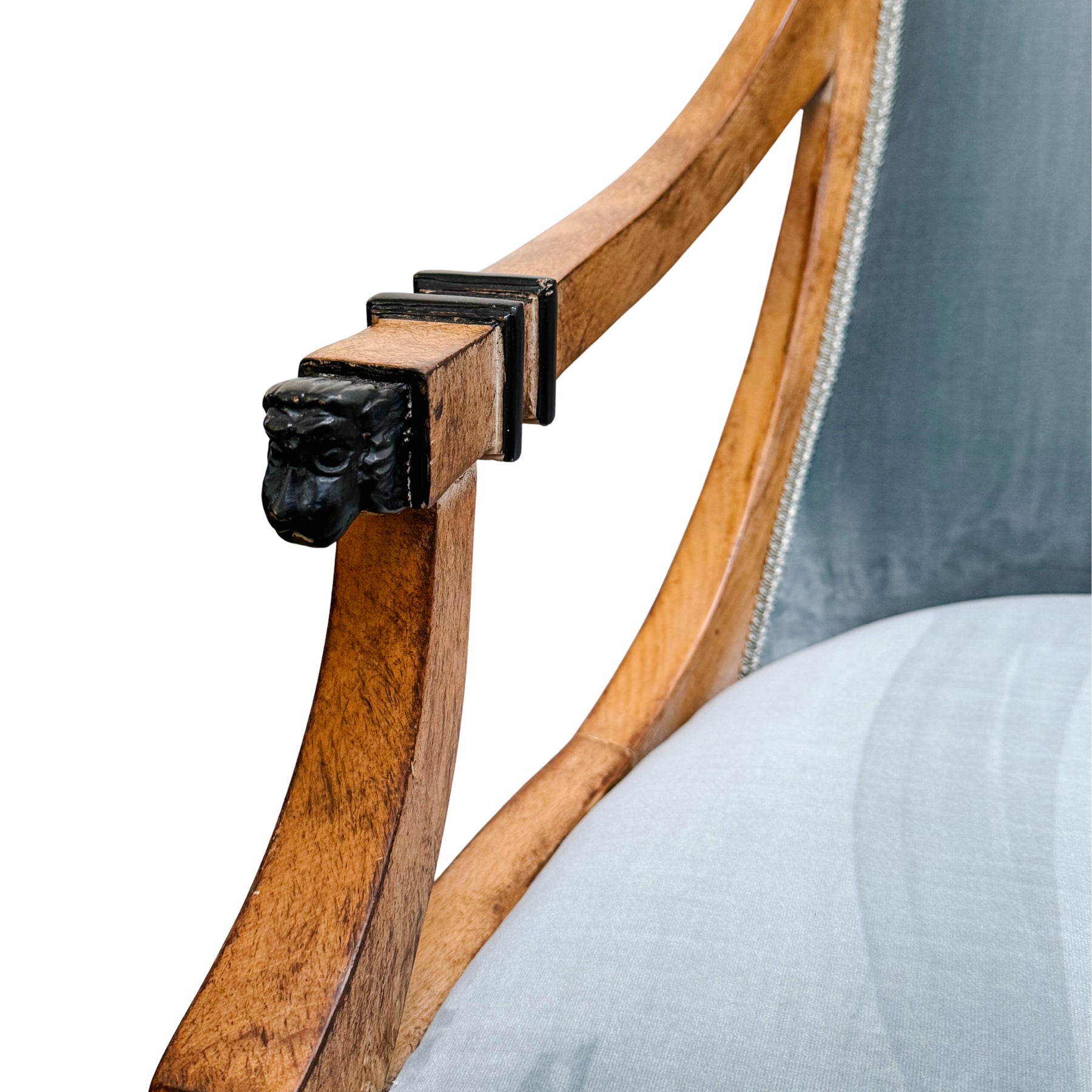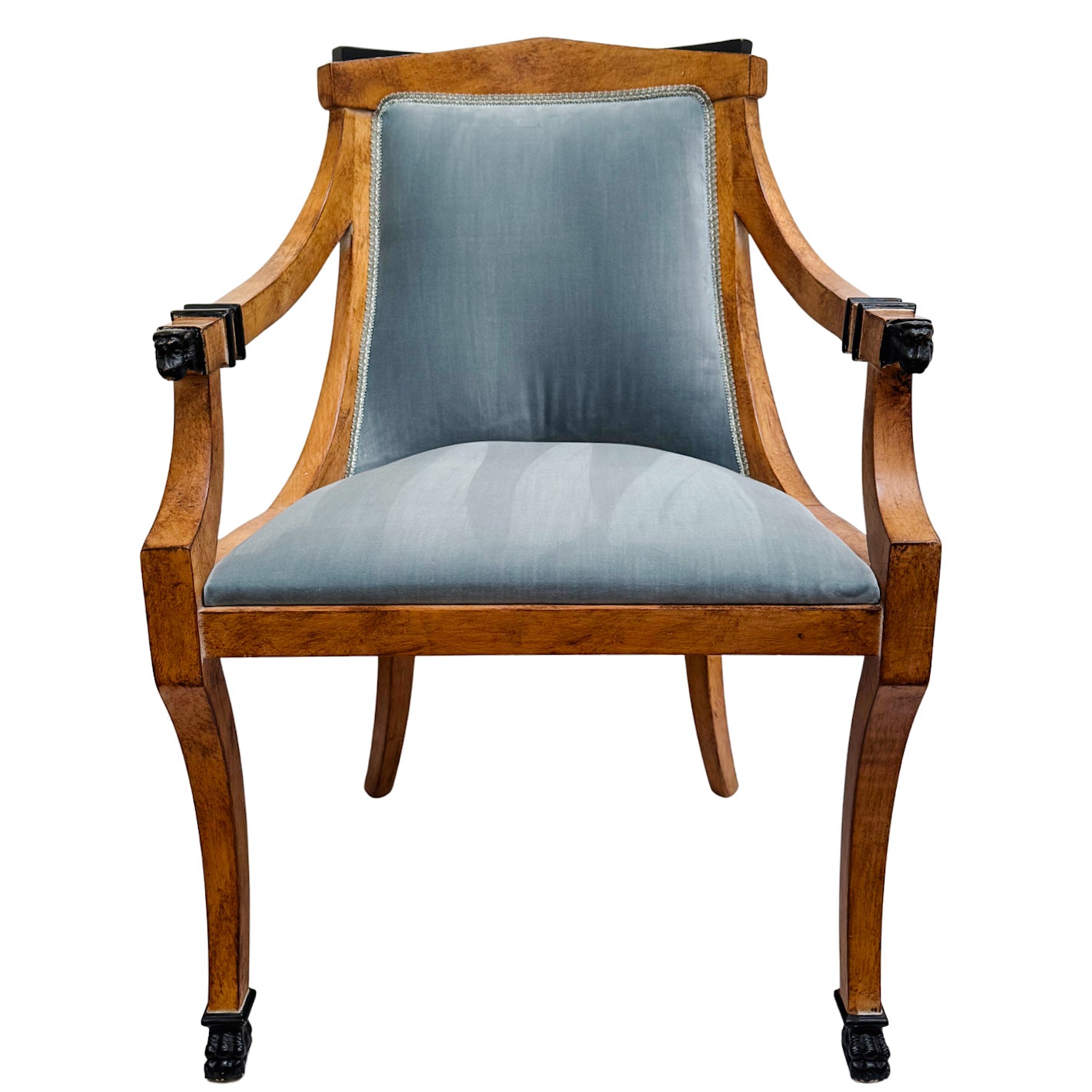 They feature lion's head masques on the arm supports and sculptural claw-and-ball feet on the front legs, both finished in a contrasting black lacquer. Scrolled, curved backs and saber-style rear legs create the iconic profile of period Neoclassical furniture. Newly reupholstered in a plush, powder blue velvet fabric, finished with a decorative silver-blue braid trim. The light, airy color beautifully contrasts the rich wood tone.