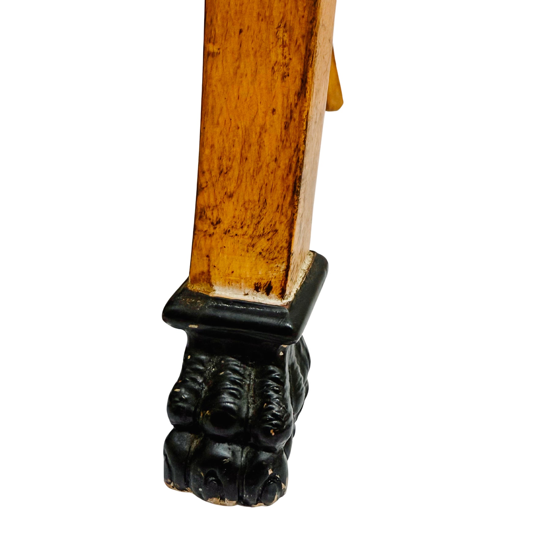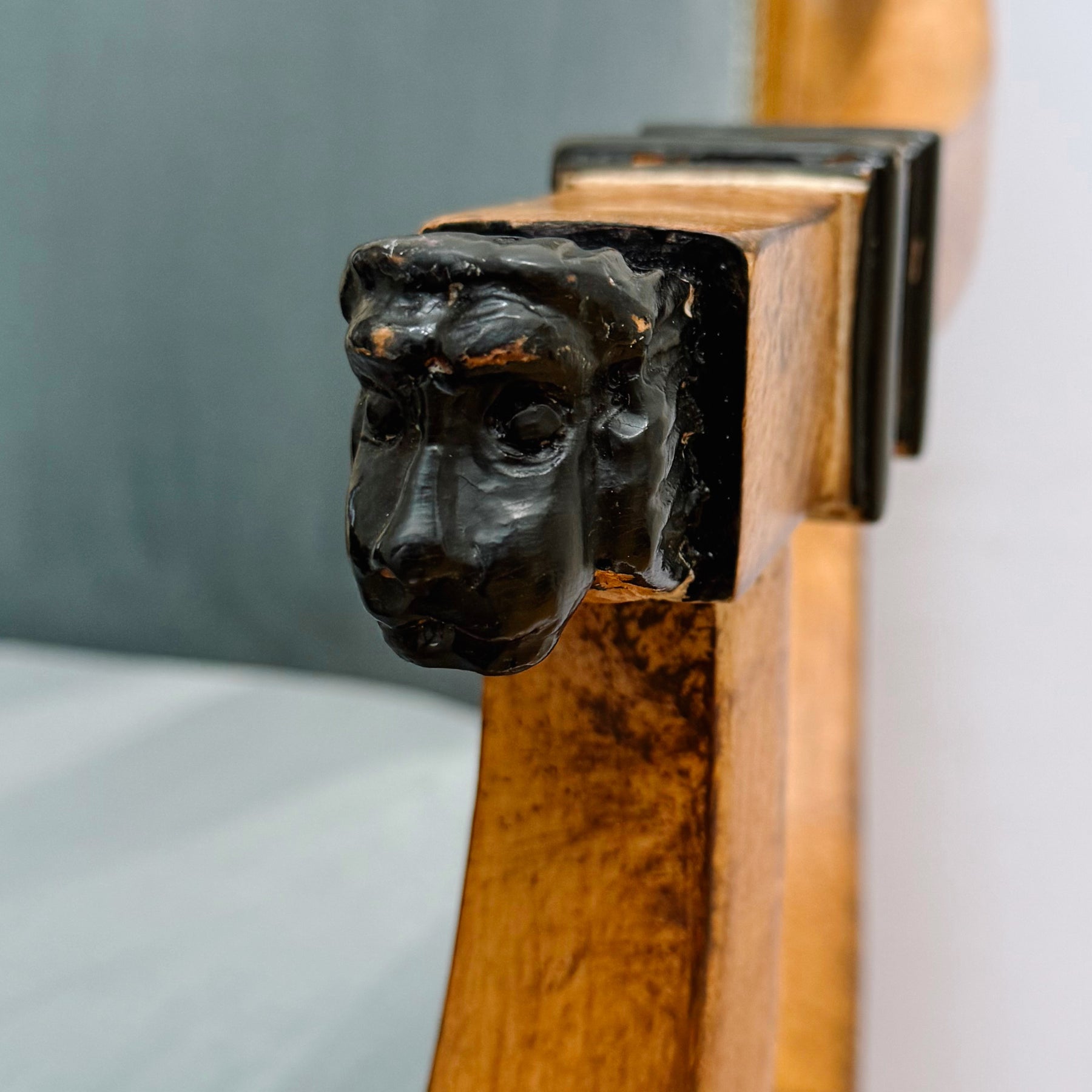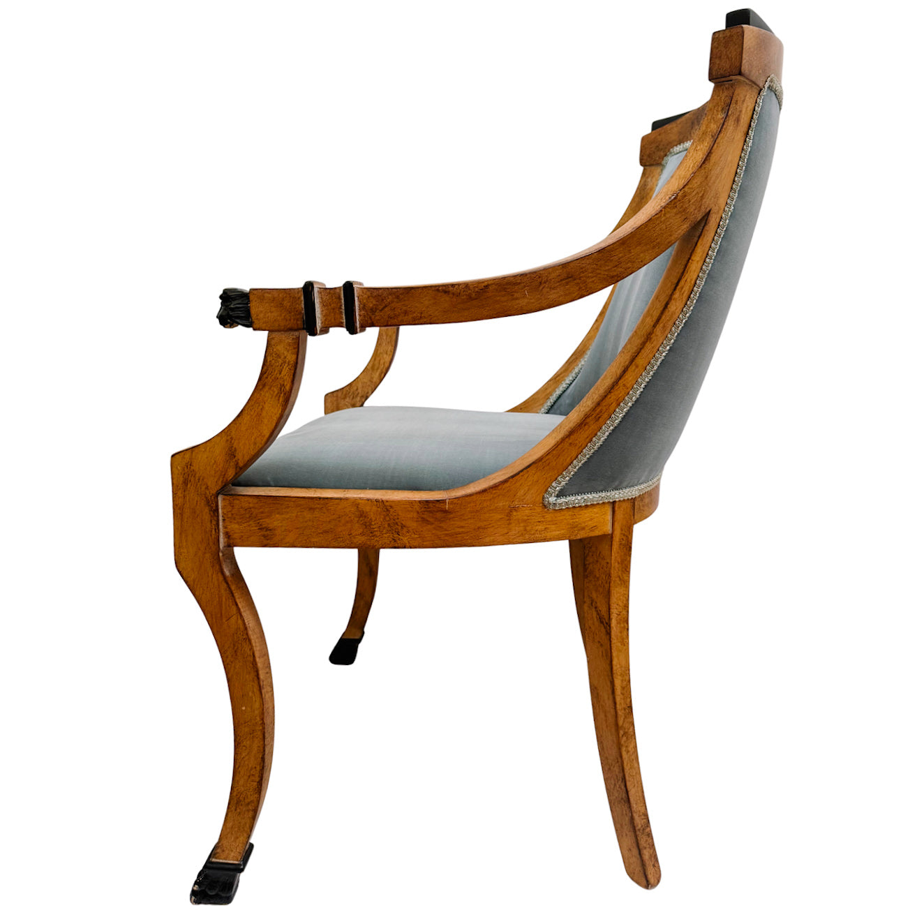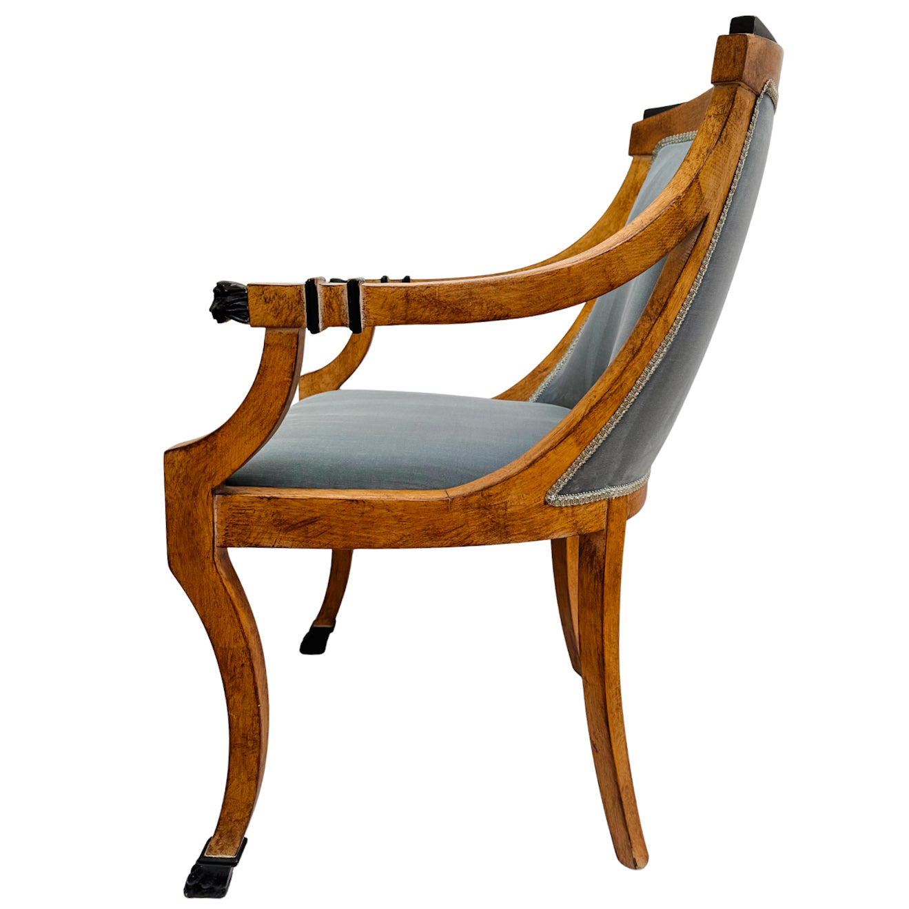 They feature lion's head masques on the arm supports and sculptural claw-and-ball feet on the front legs, both finished in a contrasting black lacquer. Scrolled, curved backs and saber-style rear legs create the iconic profile of period Neoclassical furniture. Newly reupholstered in a plush, powder blue velvet fabric, finished with a decorative silver-blue braid trim. The light, airy color beautifully contrasts the rich wood tone.