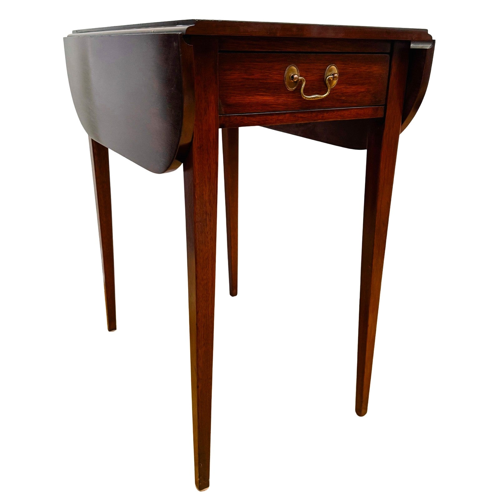 Beautiful pair of vintage American-made drop-leaf Pembroke end tables by Henkel Harris from their Virginia Galleries collection. Made from beautiful mahogany with a rich, deep finish. They feature a versatile design with two rounded drop leaves that can be raised to expand the tabletop size, and supported by four elegant, slender, Federal style tapered legs. Each table has a single, dovetailed drawer, accented with a classic brass bail pull.