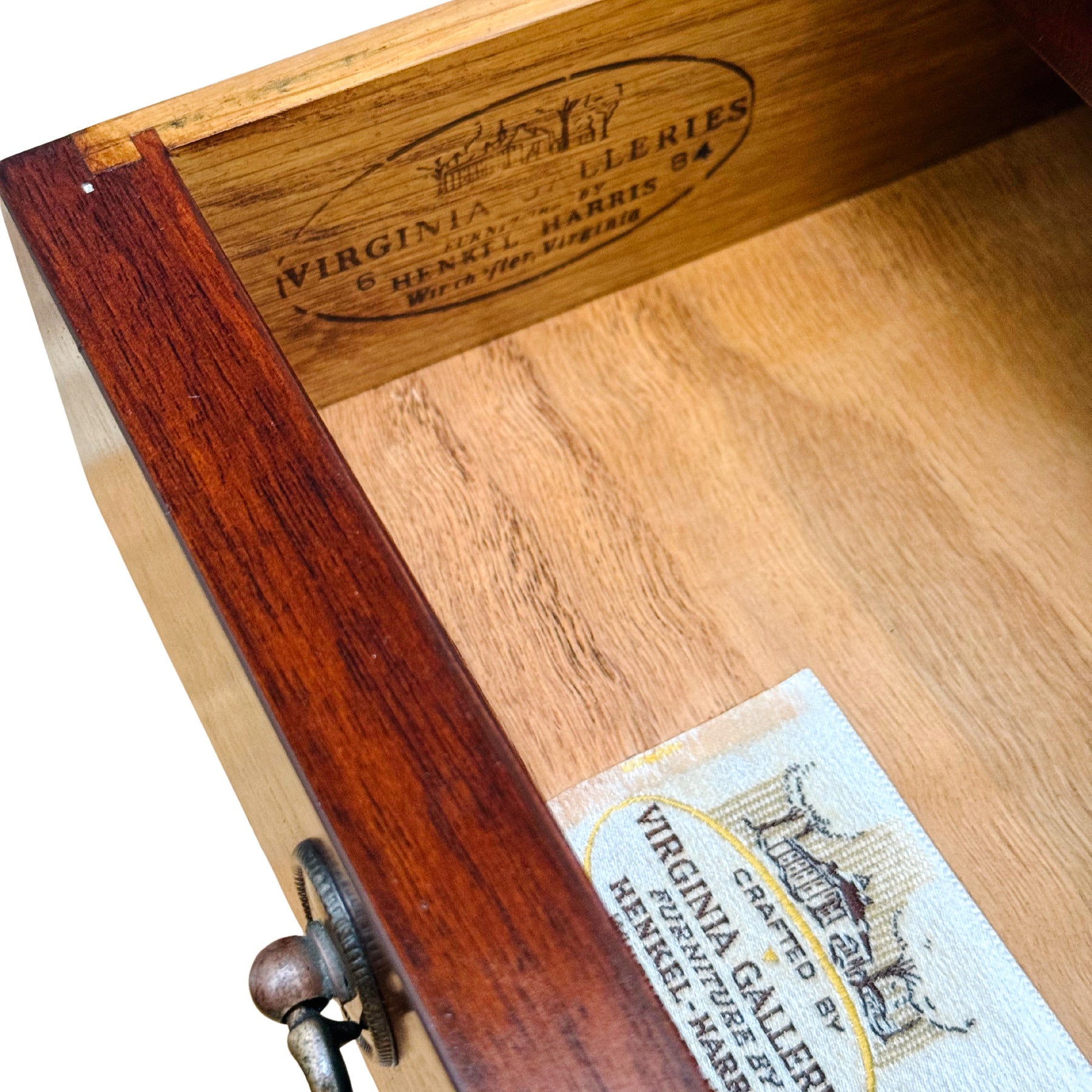 Henkel Harris primarily specialized in reproducing classic 18th-century designs (like these Pembroke Federal tables), and the "Virginia Galleries" mark was used for its premium line of reproduction furniture made between 1950 and 1980. These were likely an earlier production based on the label.