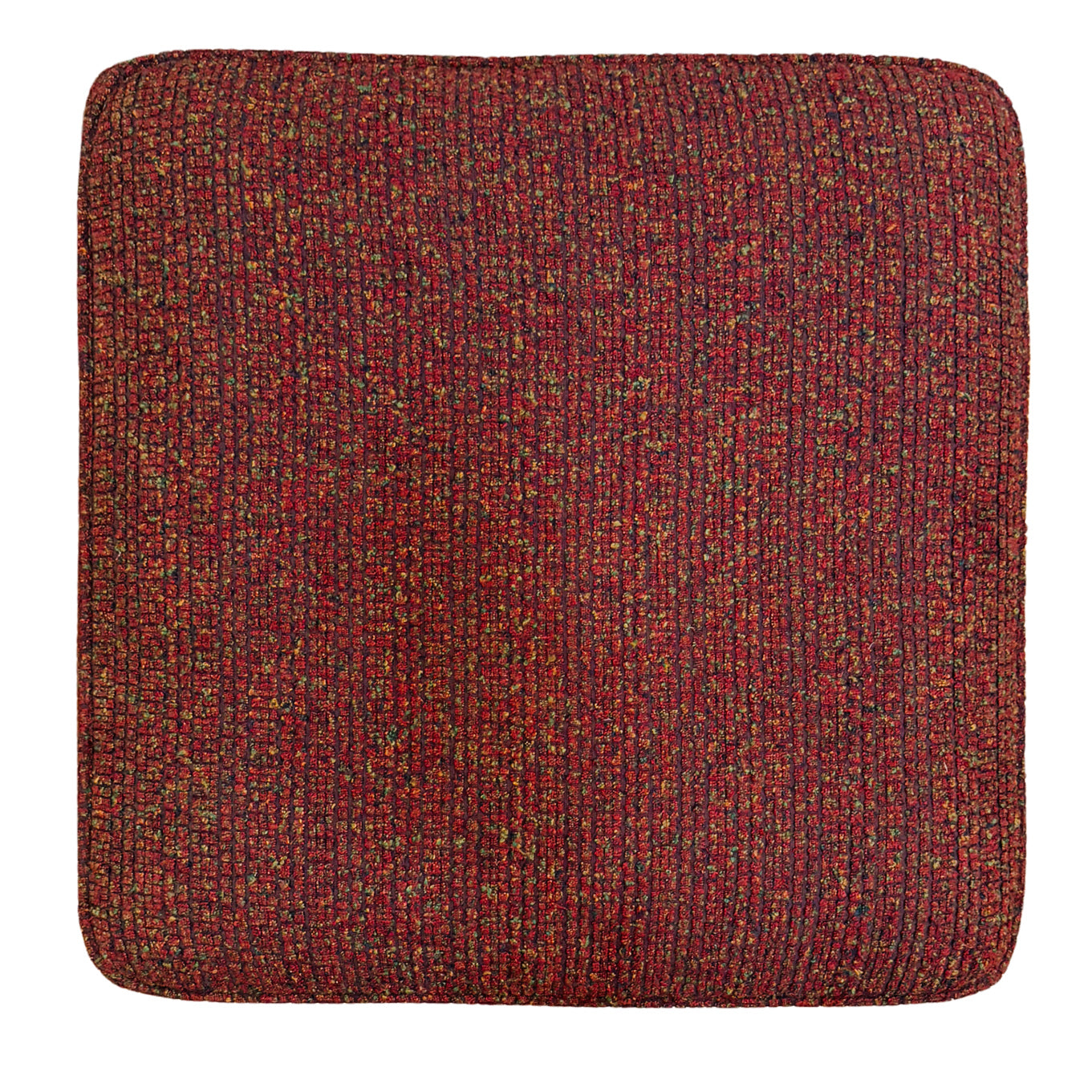 They are topped with thick cushions upholstered in a textured deep burgundy tweed/boucle fabric with flecks of complementary color. A continuous line of antique brass nailhead trim completes the classic look.