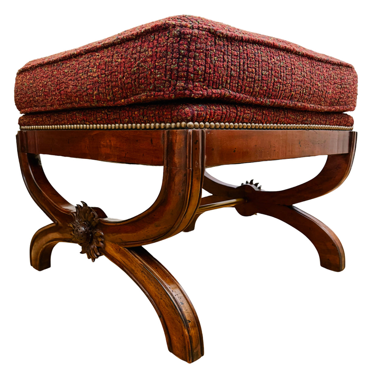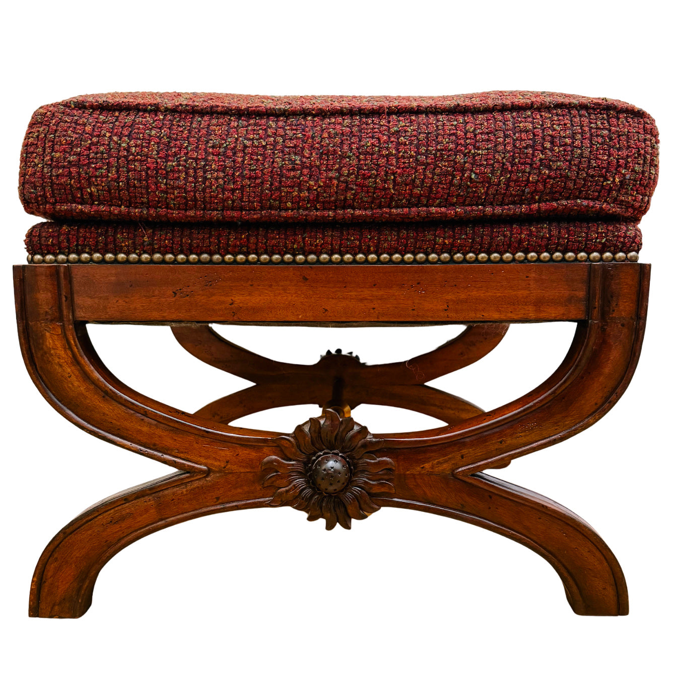 X-Frame English Regency Upholstered Ottomans With Carved Rosettes and Nailhead Trim