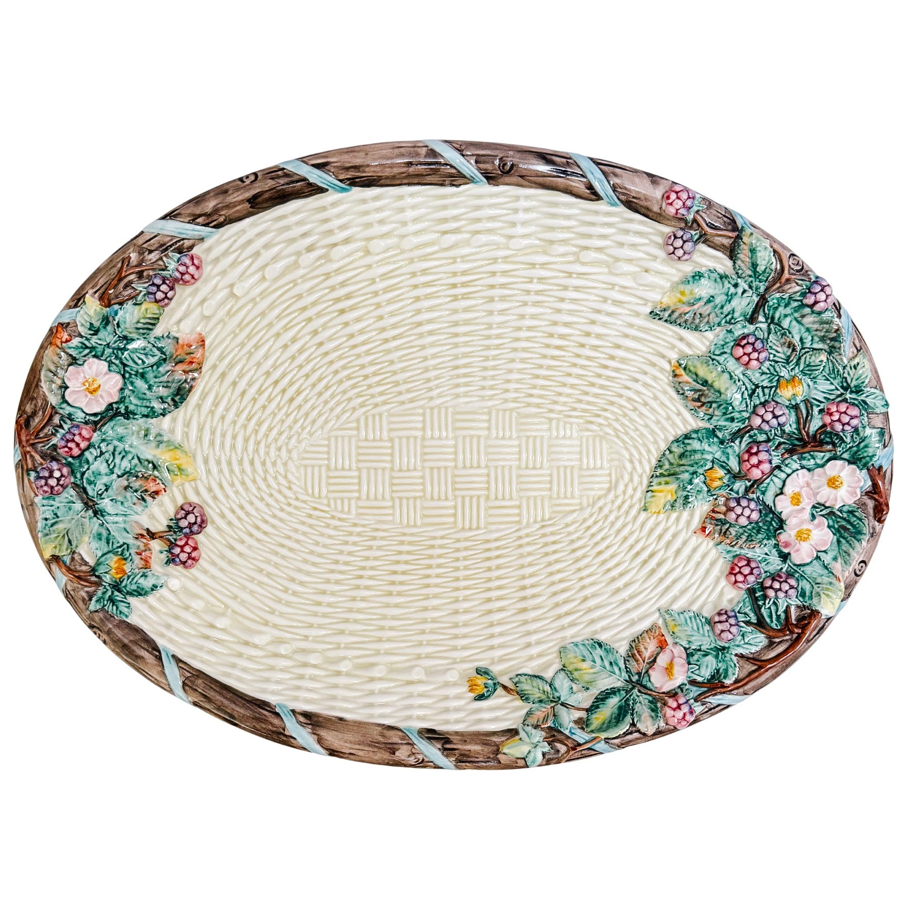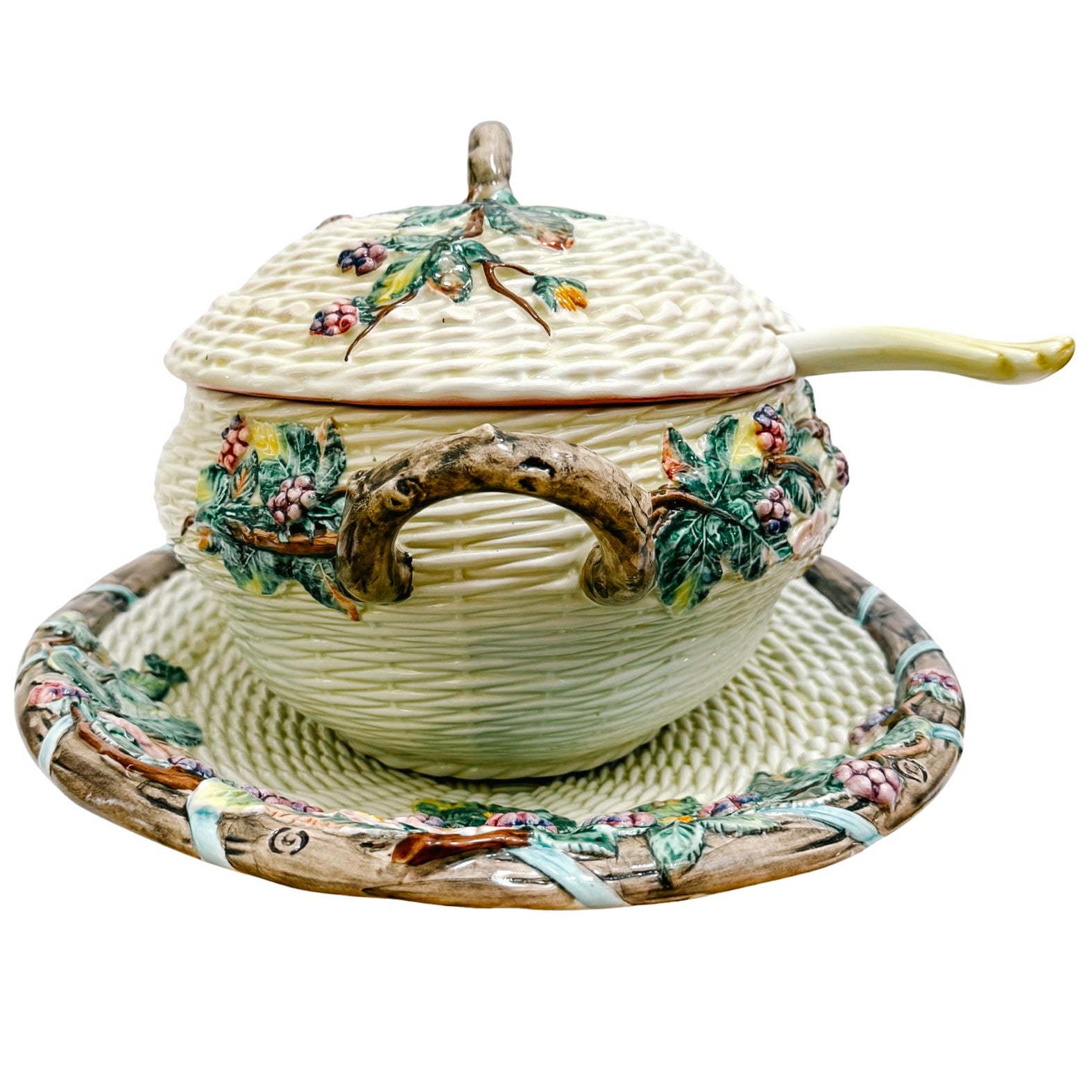 Elevate your dining room or kitchen island with this magnificent, grand scale 4-piece Italian Majolica soup tureen set. Exquisitely handcrafted and hand-painted in Italy, this oversized centerpiece features a highly tactile, dimensional design. The body and lid are textured with a classic cream basketweave pattern, adorned with lush, high-relief "barbotine" style blackberries, delicate white blossoms, and vibrant green foliage.