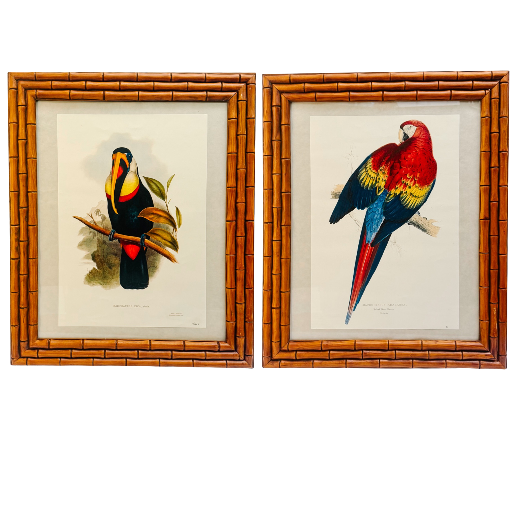 French Ornithological Bird Lithographs Macaw & Toucan in Large Faux Bamboo Frames