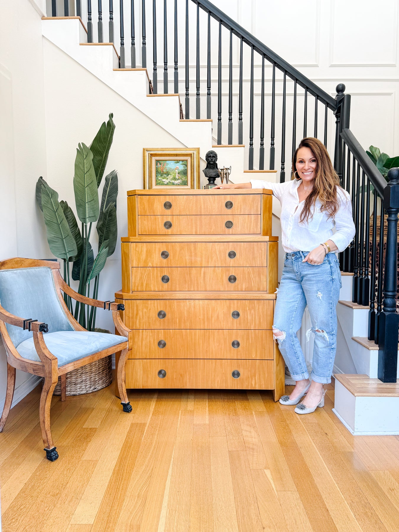 This specific Triple Chest-on-Chest is an exceptionally rare find from Pfister’s collaboration with Baker Furniture. Baker, known globally for producing museum-quality pieces, selected Pfister to design one of their premium, architecturally-driven lines. The 'Primavera' model, named perhaps for the spring-like, optimistic quality of its wood grain or design, is highly sought after by collectors. Its distinct configuration — a triple-width chest paired with the layered chest-on-chest structure — was produced in limited numbers, making it a true centerpiece.