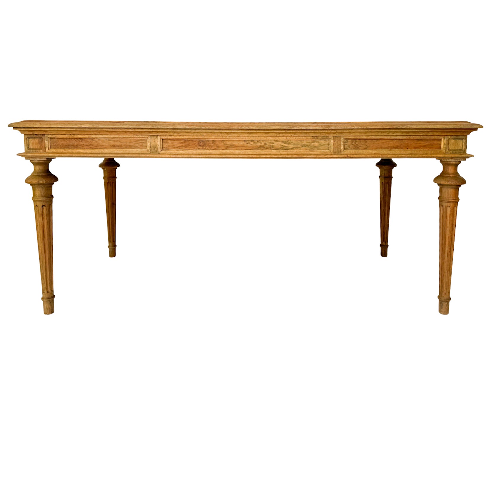 A beautiful 19th century French Neoclassical library desk reinterpreted by Restoration Hardware as a large dining table. Crafted by hand of solid oak and fine veneers, the table features straight, clean lines with small, geometric shapes and tapering, columnar legs which unscrew for easy move.