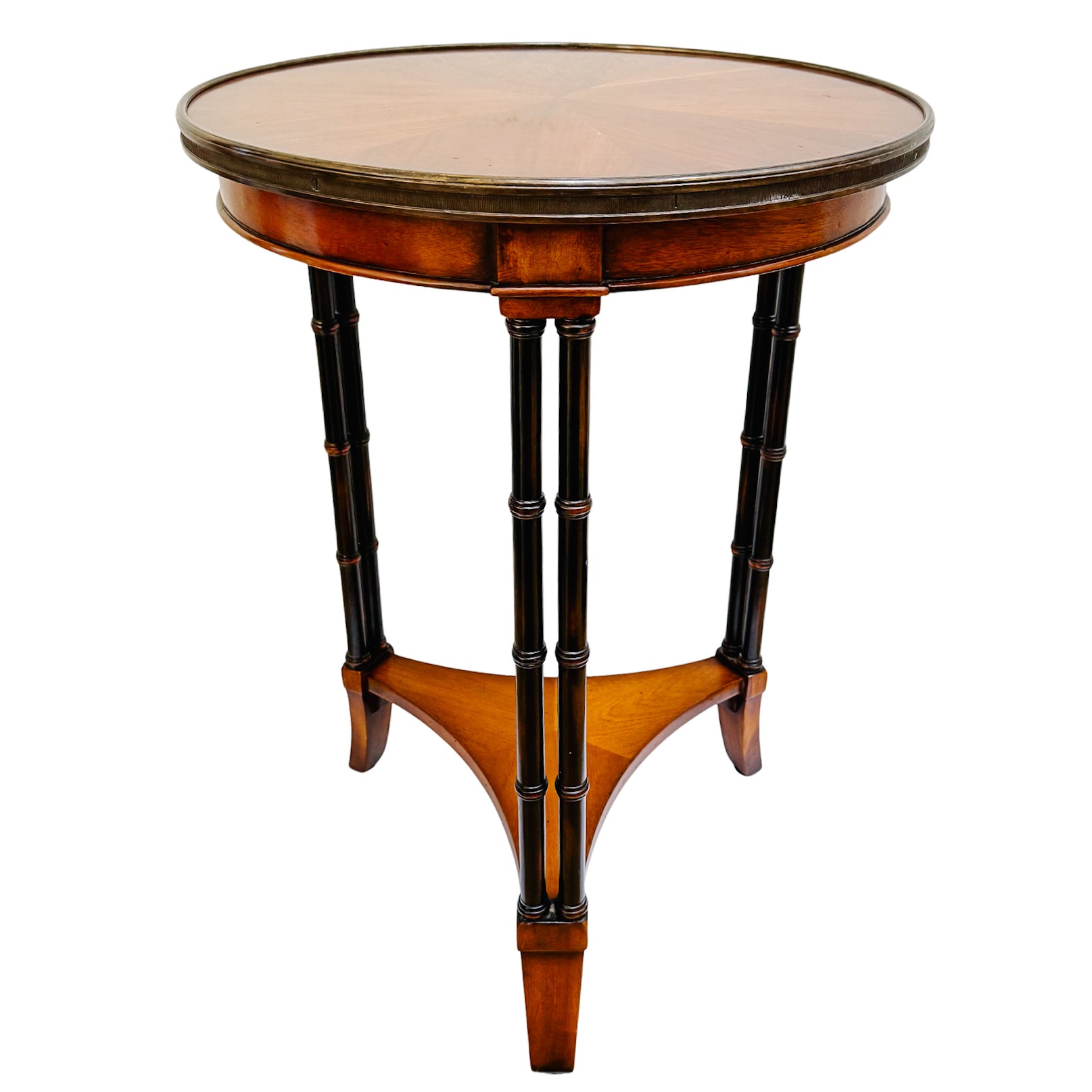 A beautifully crafted Neoclassical style accent table featuring a round mahogany top with a sunburst (starburst) veneer pattern, radiating from the center to highlight the natural depth and warmth of the wood grain. The perimeter is finished with a sophisticated brass gallery rail, adding a practical "no-slip" security for your favorite decor or cocktails.