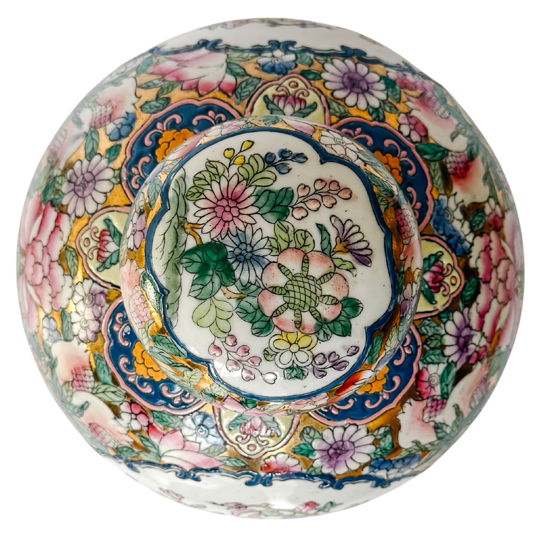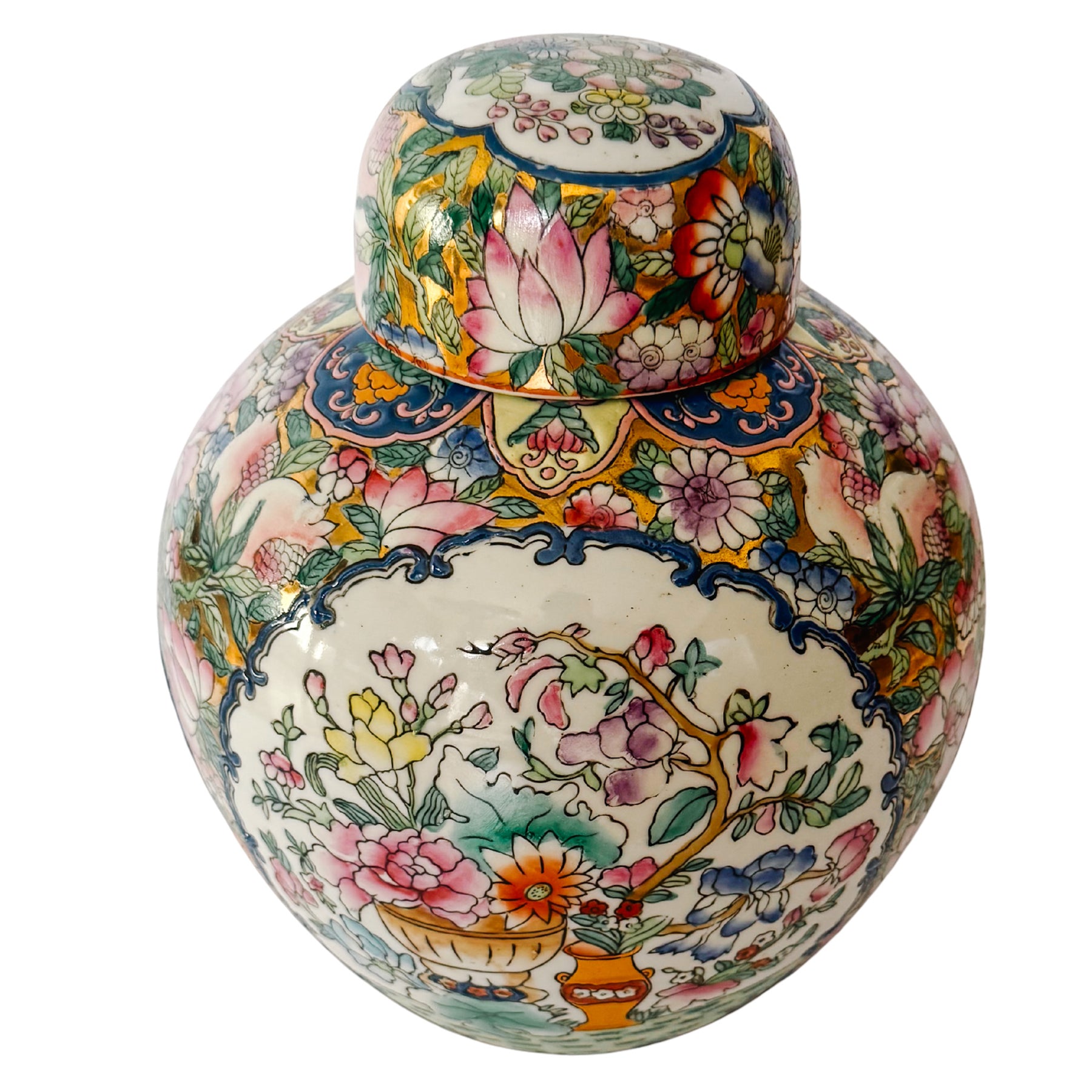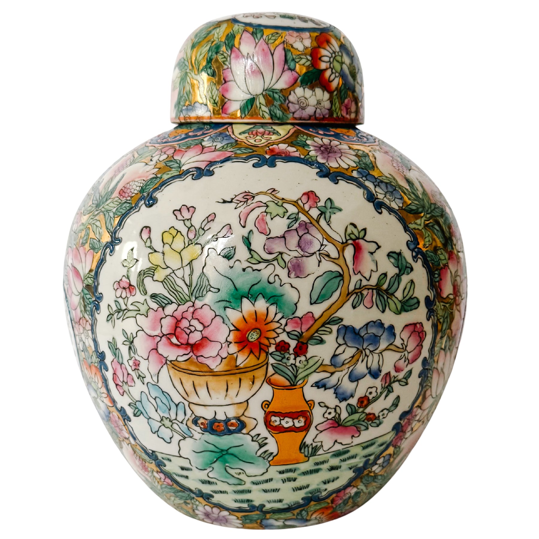 Vintage Gold Mirrored Chinese Famille Rose Lidded Ginger Jar