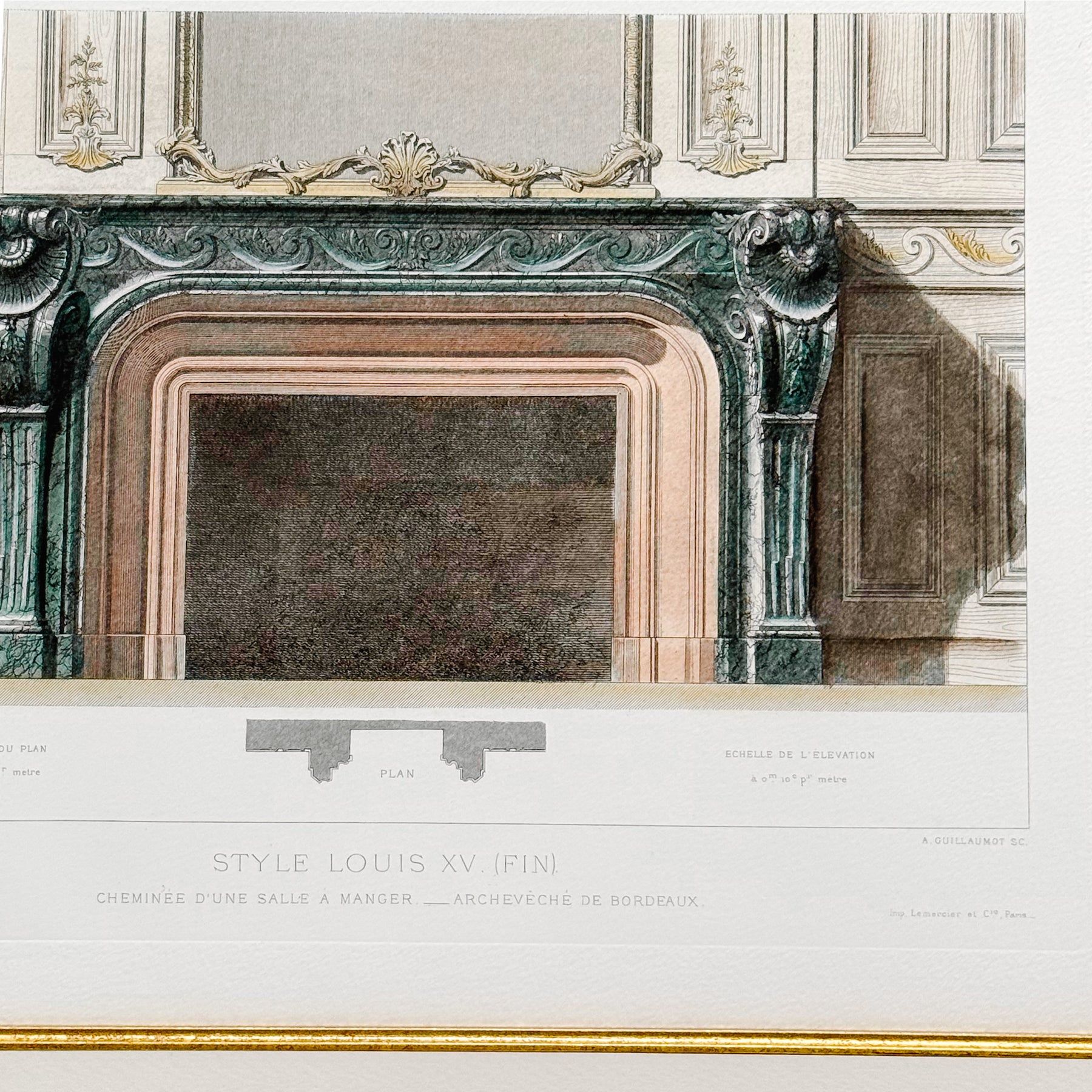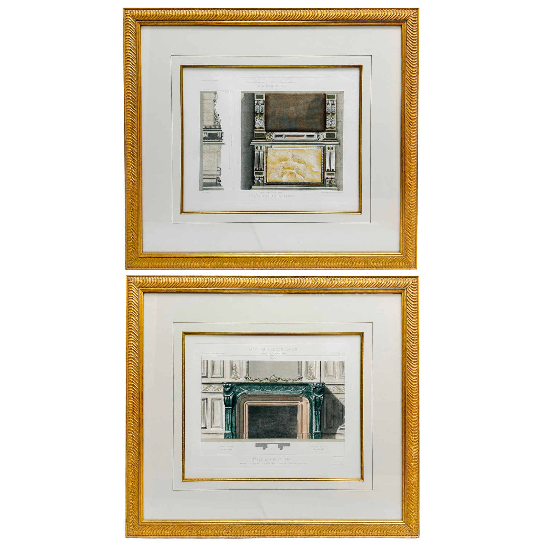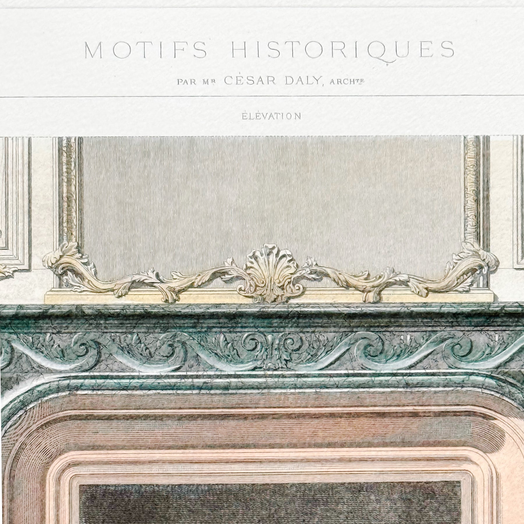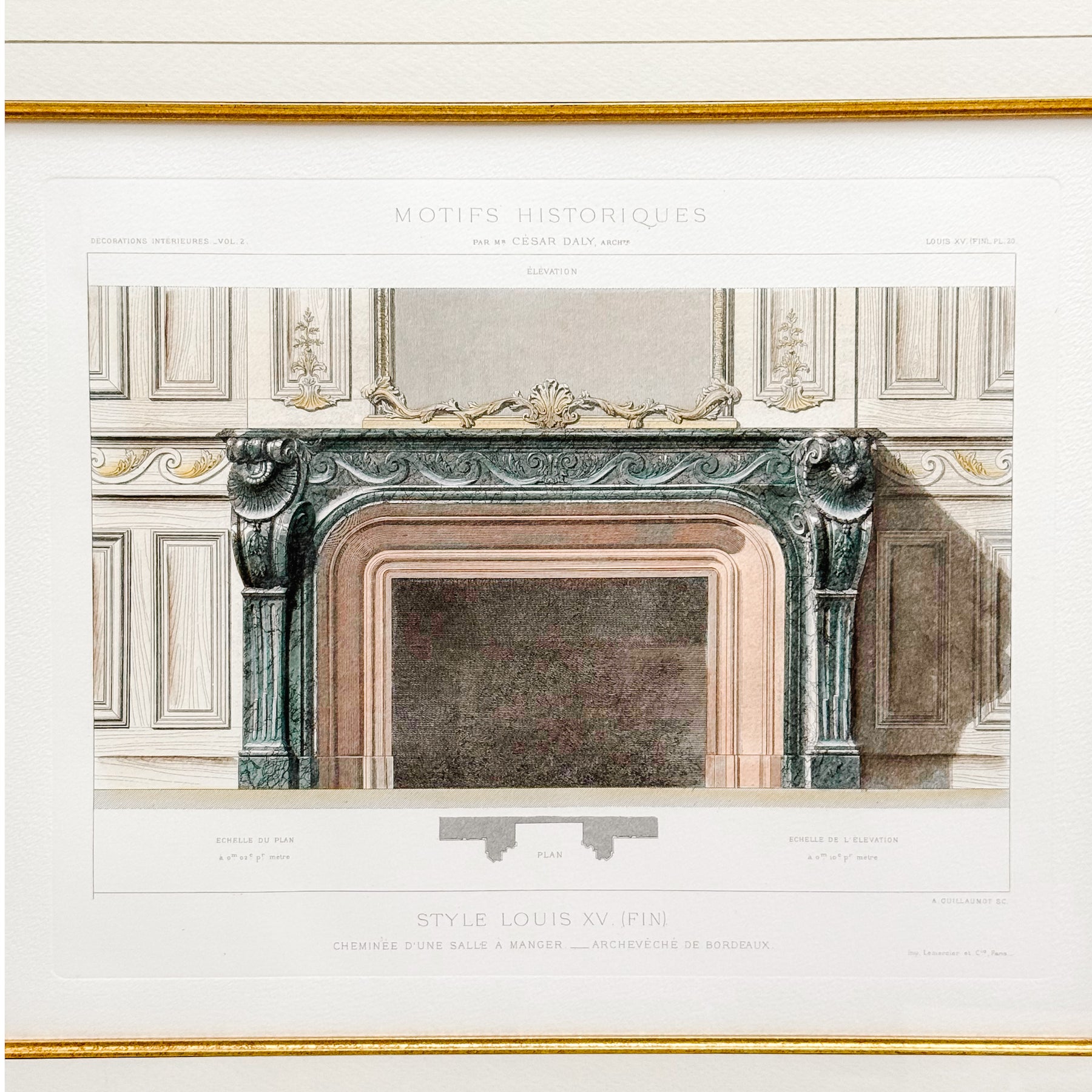 Pair of hand-colored antique architectural engravings from the publication Motifs Historiques by César Daly, a renowned 19th-century French architect and editor. Double matted and framed under glass. These prints showcase the luxurious interior design of 19th-century France, specifically featuring two distinct fireplace mantle designs.