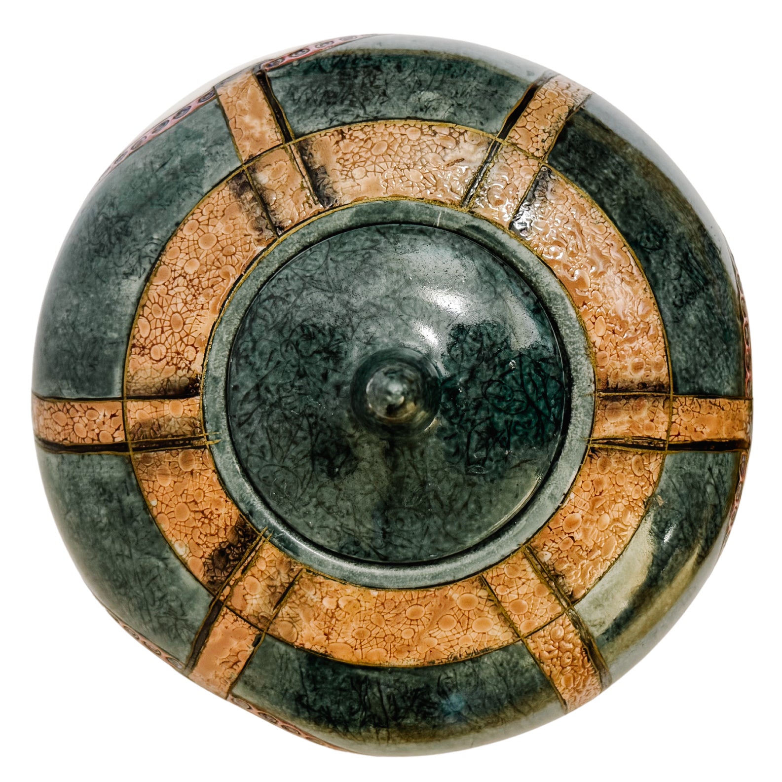 A beautiful vintage Chinese porcelain ginger jar featuringan elegant and sophisticated European equestrian design with a rich, dark teal glaze with an intricate marbled texture. Two large medallions depicting jockeys in mid-stride, framed by ornate gold-tone chain and harness detailing that evokes a classic English country estate feel.