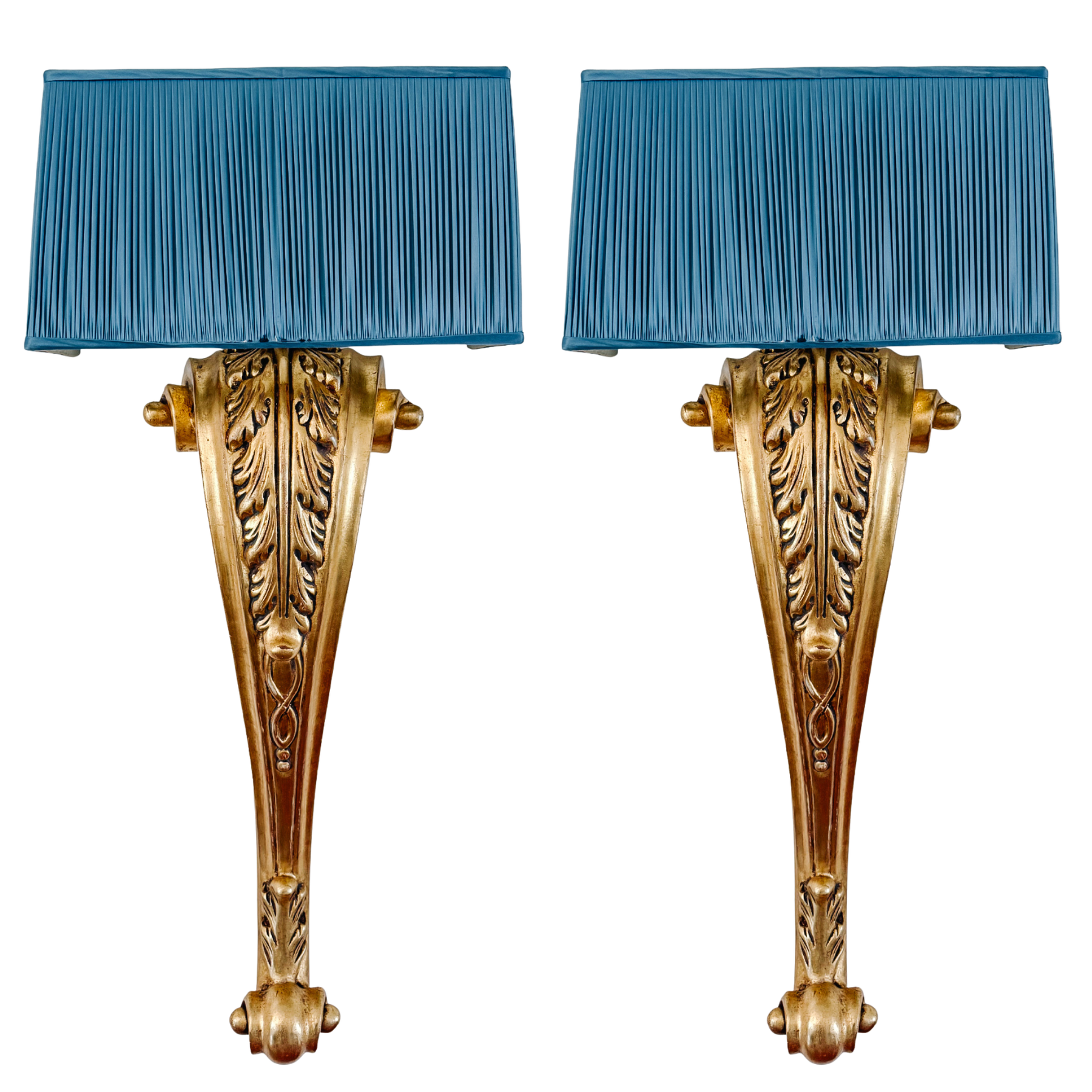 Pair of Grand Scale Parisian Giltwood Corbel Sconces With Blue Pleated Silk Shades