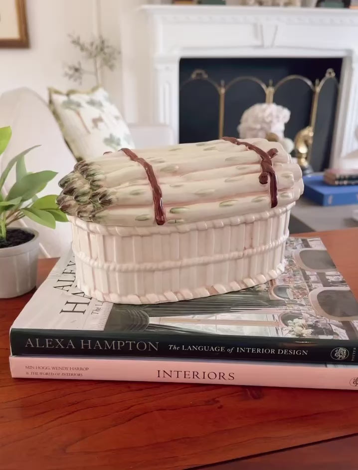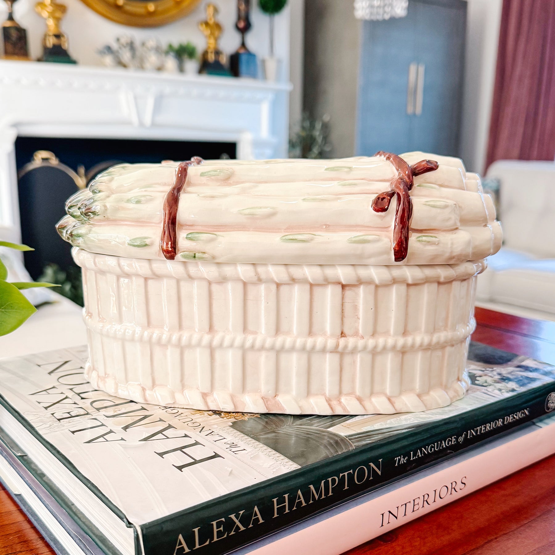 Vintage Italian ceramic asparagus form lidded tureen featuring a cover modeled as a bundle of white asparagus with green tips tied with brown ribbon, sitting atop a white, rope-detailed basket base. Perfect for serving hot asparagus, vegetables, or used simply as a captivating decorative accent in a kitchen or dining room. The quality hand-painted ceramic adds an authentic, rustic charm. Excellent for display as well when not in use.
