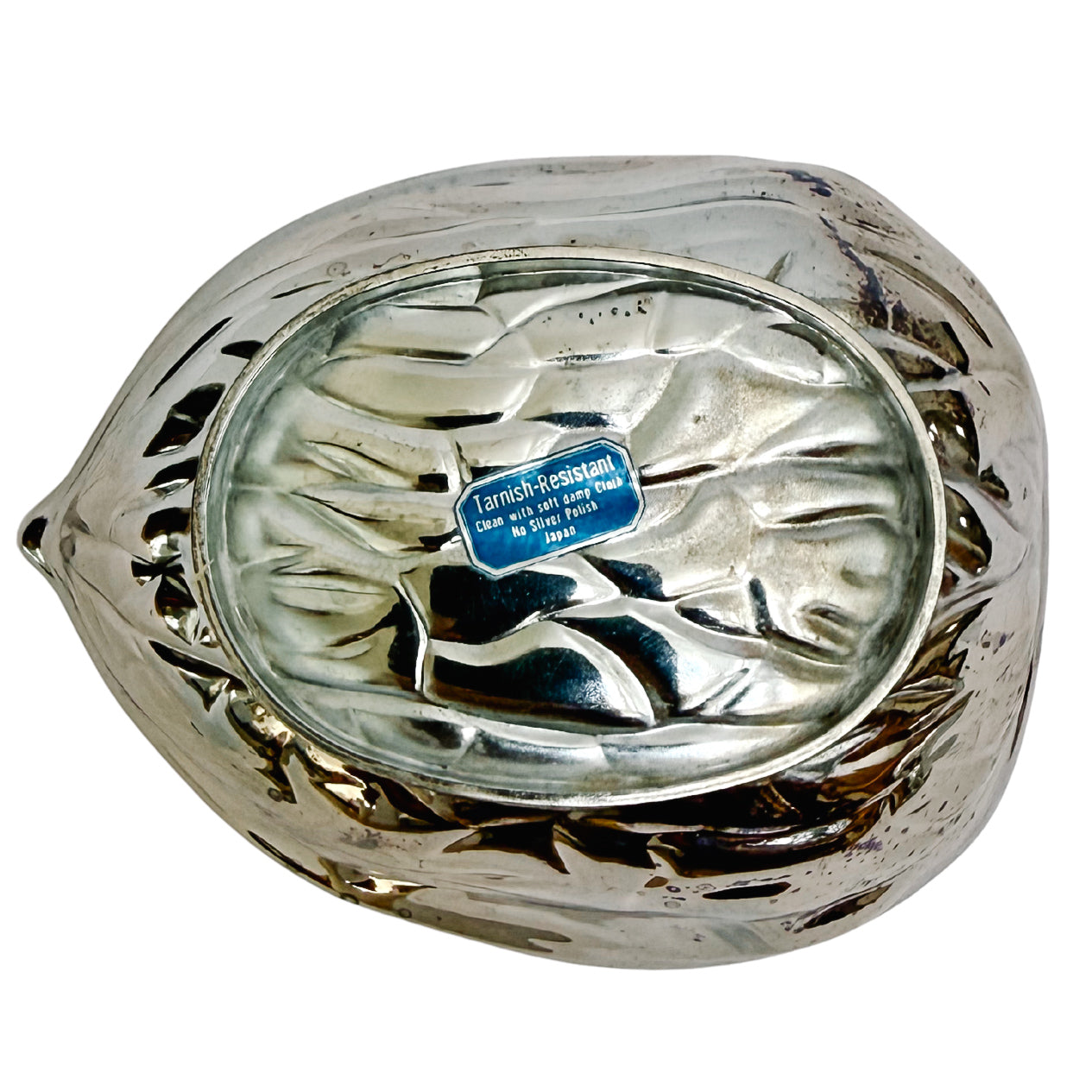 Add a touch of whimsical Mid-Century elegance to your home with this striking vintage walnut-shaped nut box made for F.B.Rogers Silver Company. It features a highly detailed, textured exterior that mimics the natural ridges of a walnut shell, finished in a brilliant, reflective silver plate.