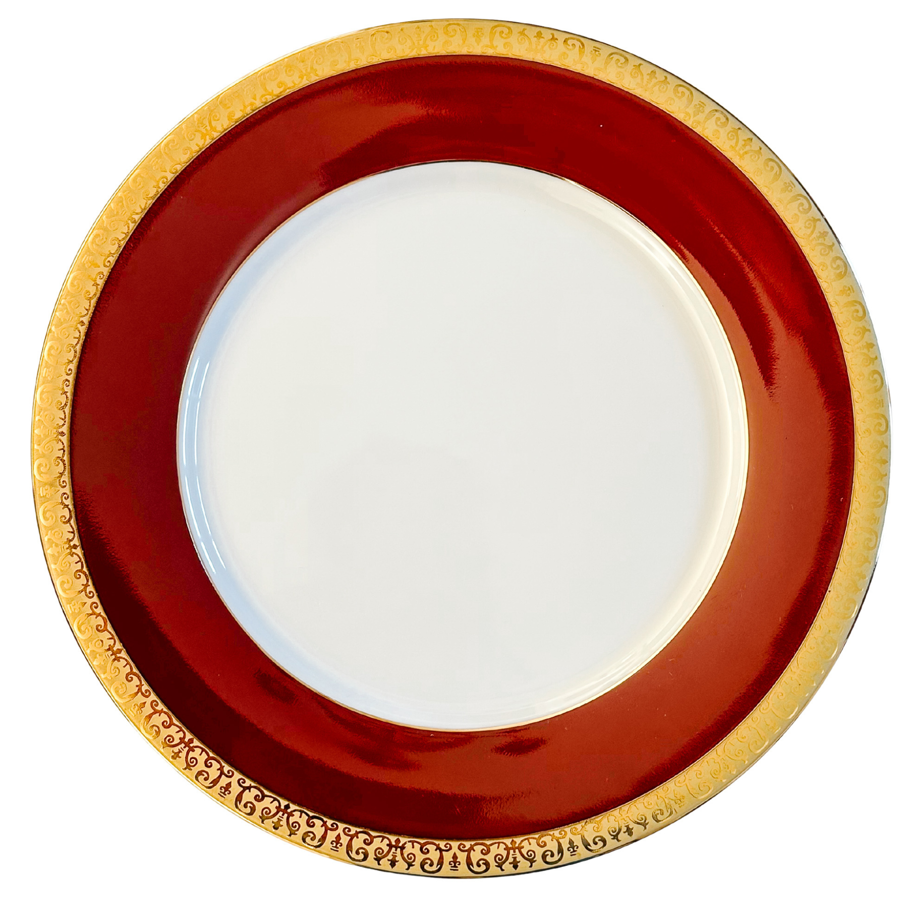 Set of six salad porcelain plates by the Federated Department Stores (the old Macy's name) and featuring thick red, green and black bands with intricate, embossed gold filigree and fleur-de-lis motif against crisp, white porcelain.