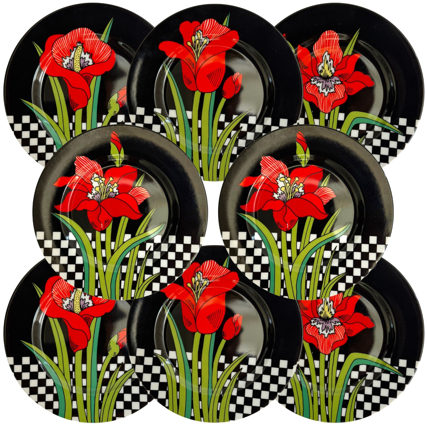 Beautiful Art Deco style salad plates by Fitz and Floyd made featuring four striking red flowers against a black background with black and white checkered bottom half. Very striking!