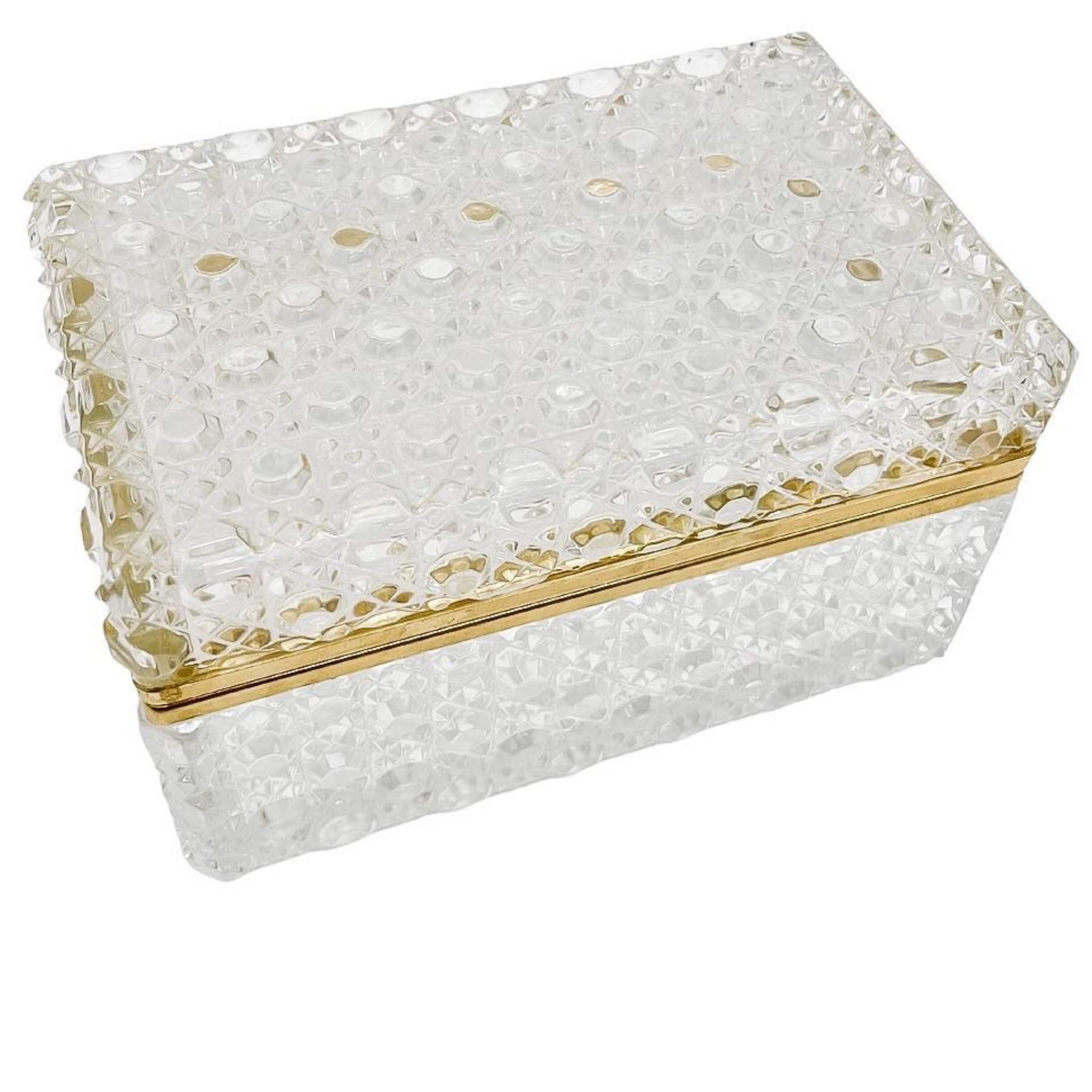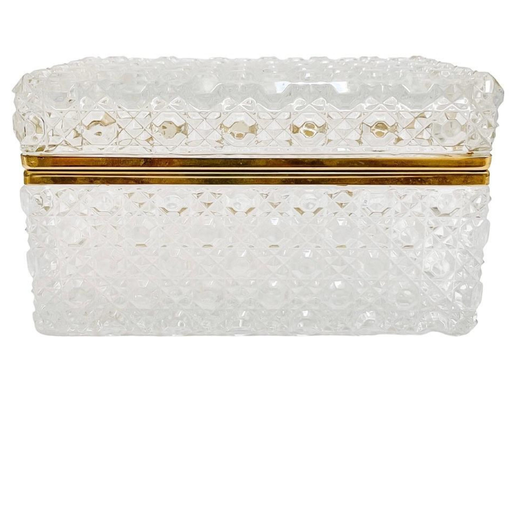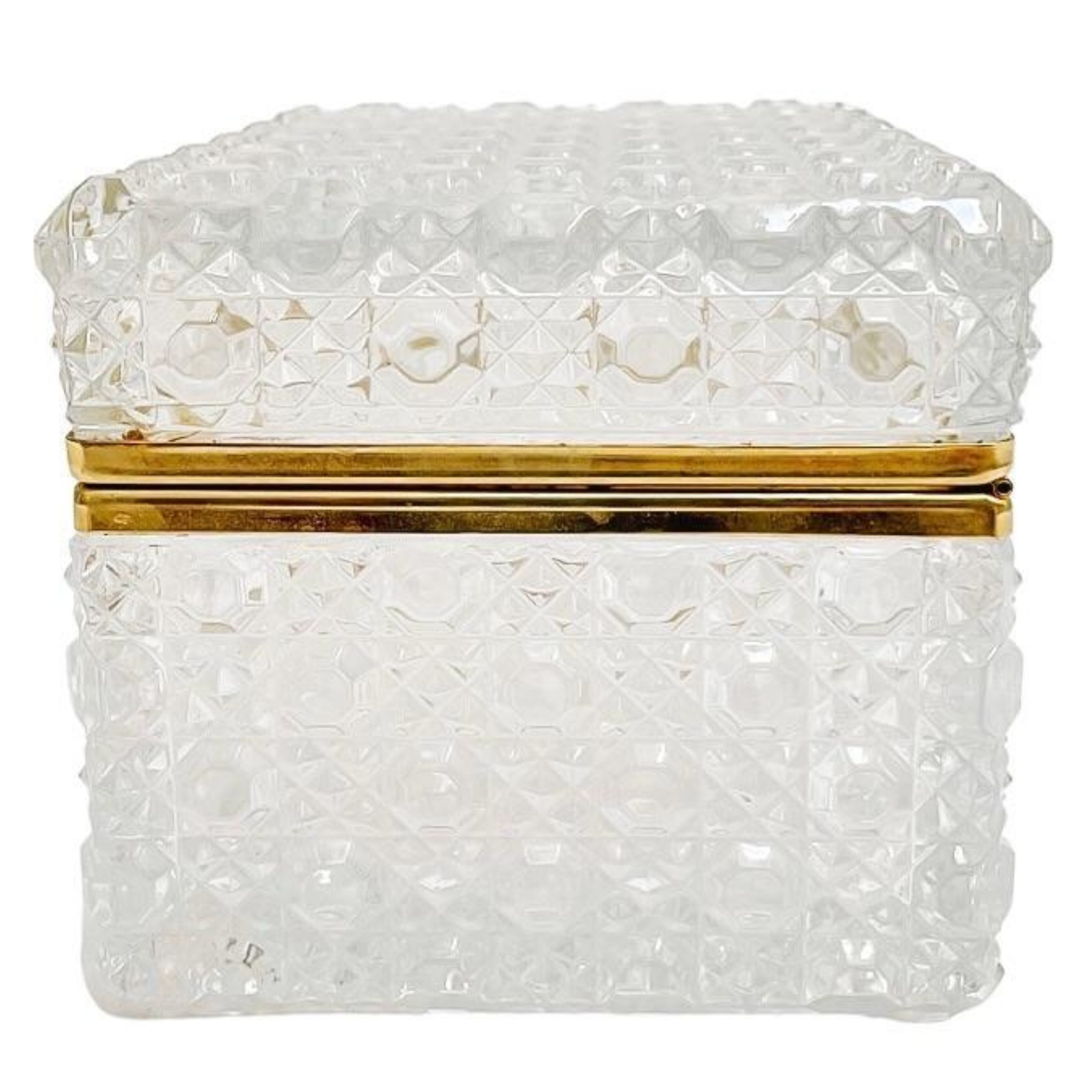 A luxurious vintage French diamond cut crystal hinged casket box with brass frame. Add it to the powder room vanity or bedroom nightstand for a touch of old Hollywood glamour. Perfect for jewelry or storing precious souvenirs, like photos, letters and postcards.