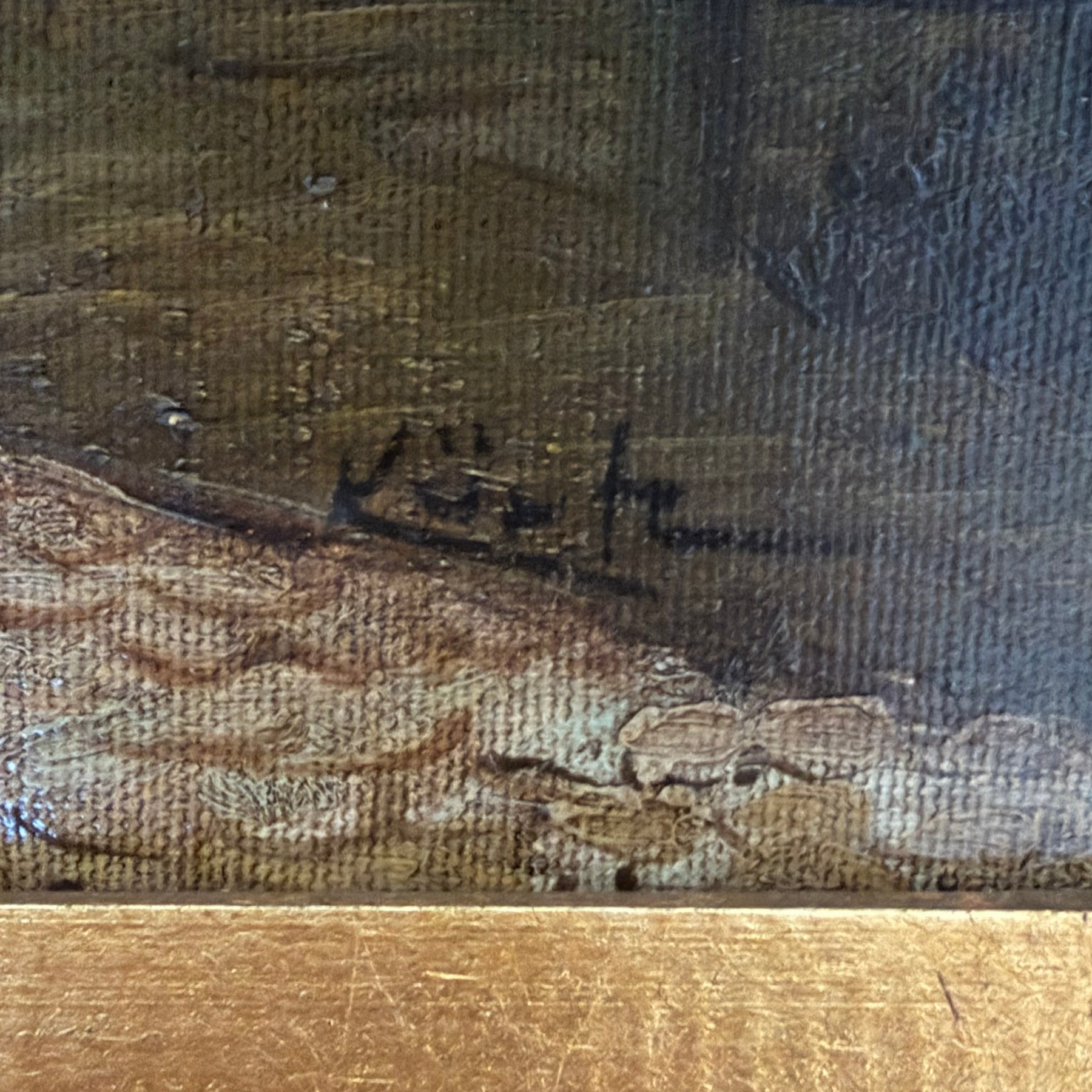 A mid-century oil on canvas that pays homage to the legendary Dutch master Willem Koekkoek (1839-1895). Signed by the artist Kürtz, this expansive 40-inch work captures the 'Romantic' revival style that was highly coveted in the mid-20th century.