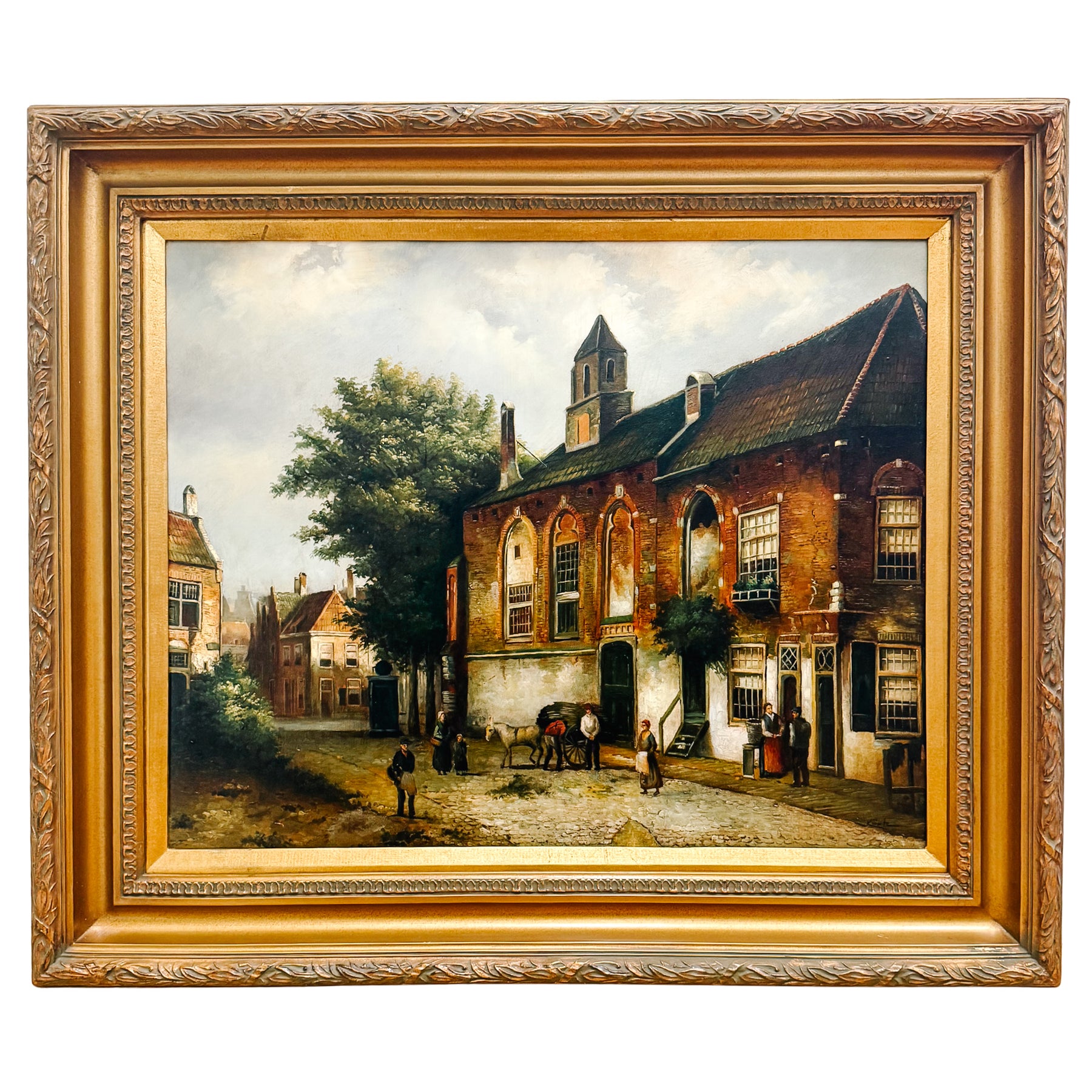 Featuring the iconic stepped gables and sun-drenched cobblestones typical of the Dutch tradition, this piece offers the grand 'Old Master' aesthetic at a more accessible scale and price point. Housed in its original, substantial 3-inch deep gilded frame.