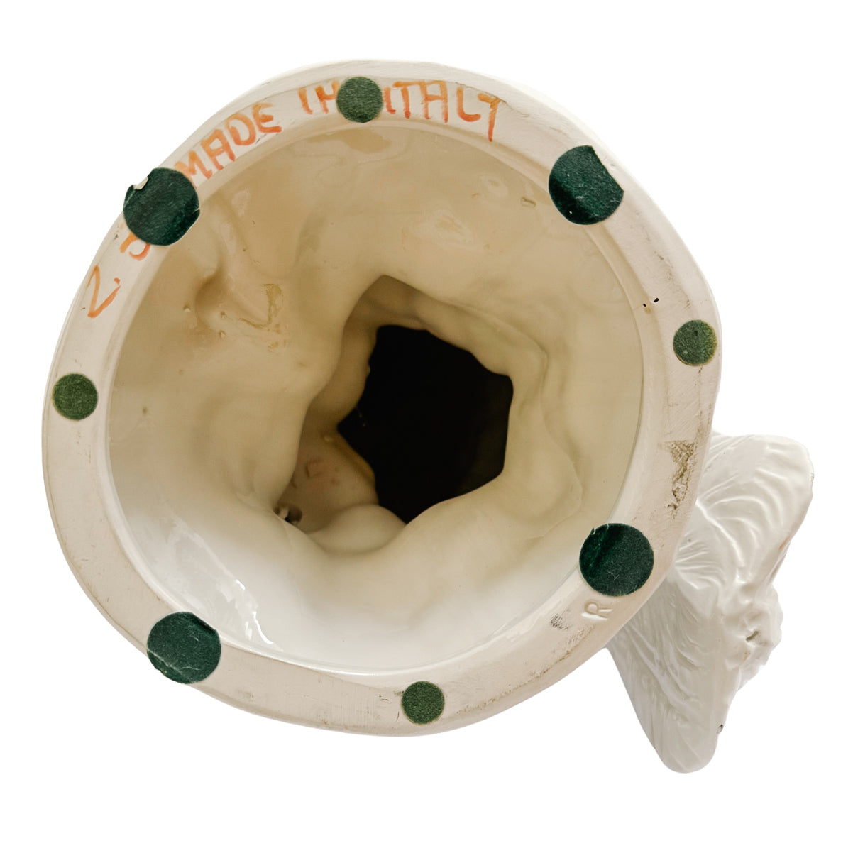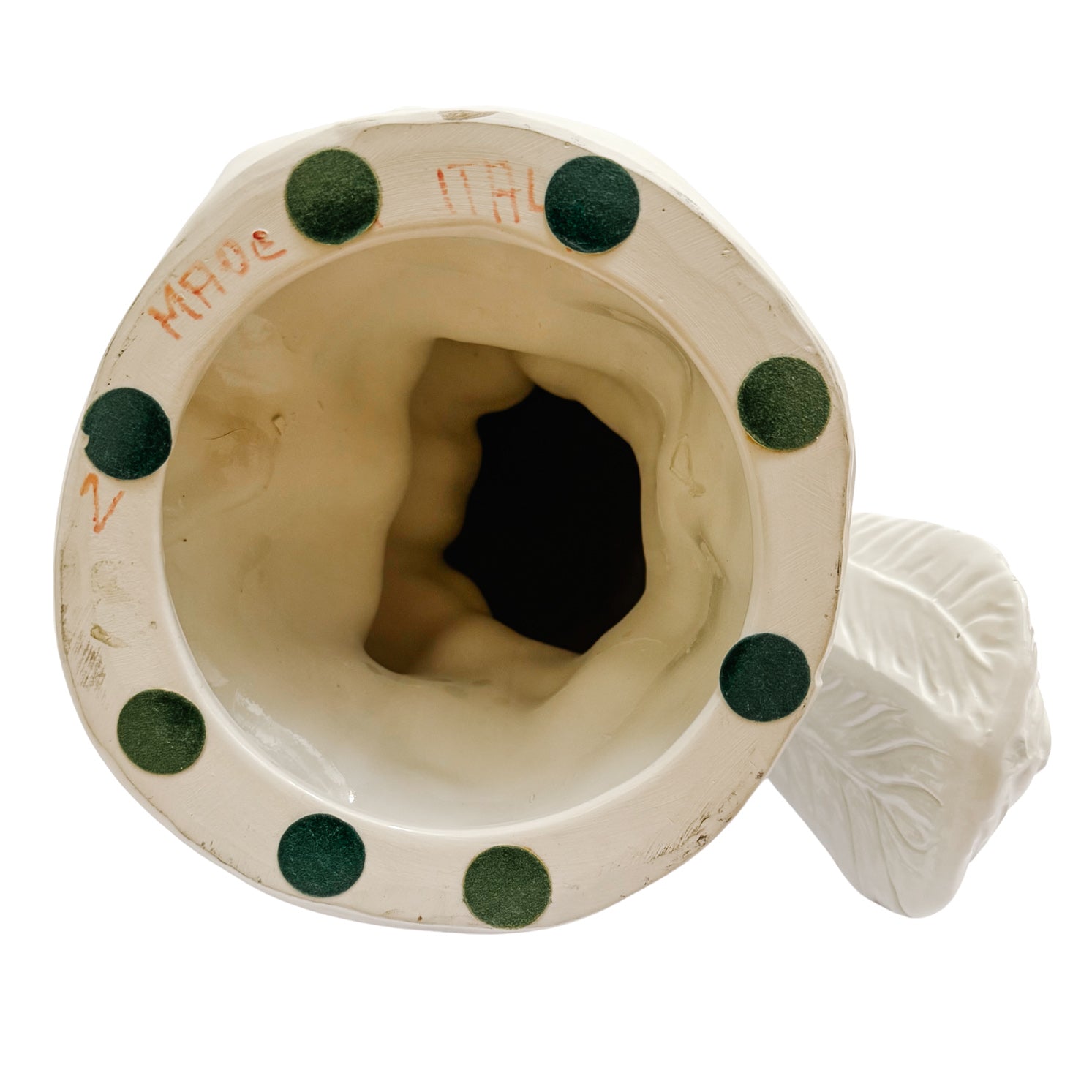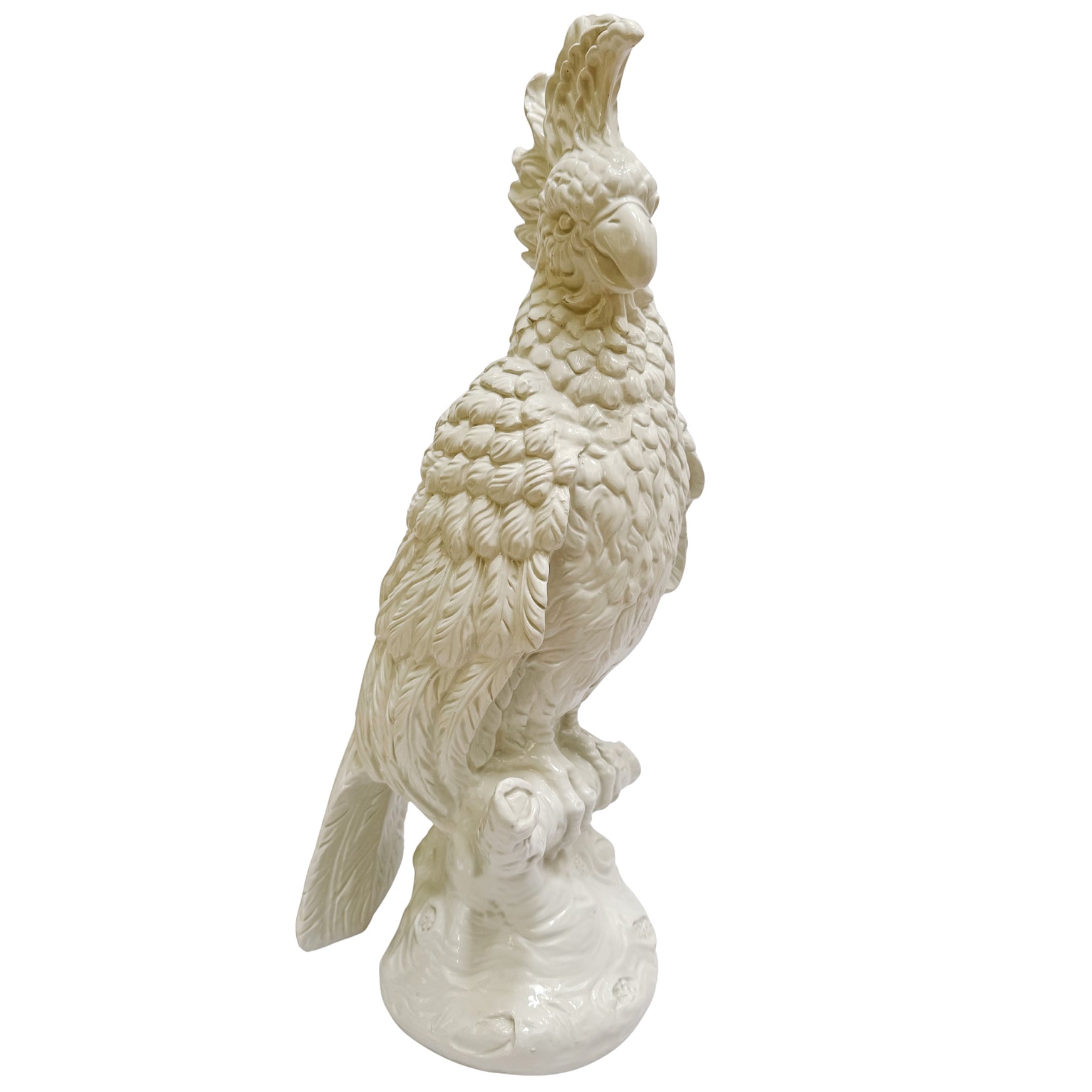 A striking pair of large scale mid-century Italian white glazed ceramic cockatoos. Standing at an impressive 17.5 inches tall, these statues capture the elegant silhouettes of the iconic birds, perched atop stylized branches. Each bird features intricate molded details, from the individual scalloping of the feathers to the expressive texture of their crests and beaks.