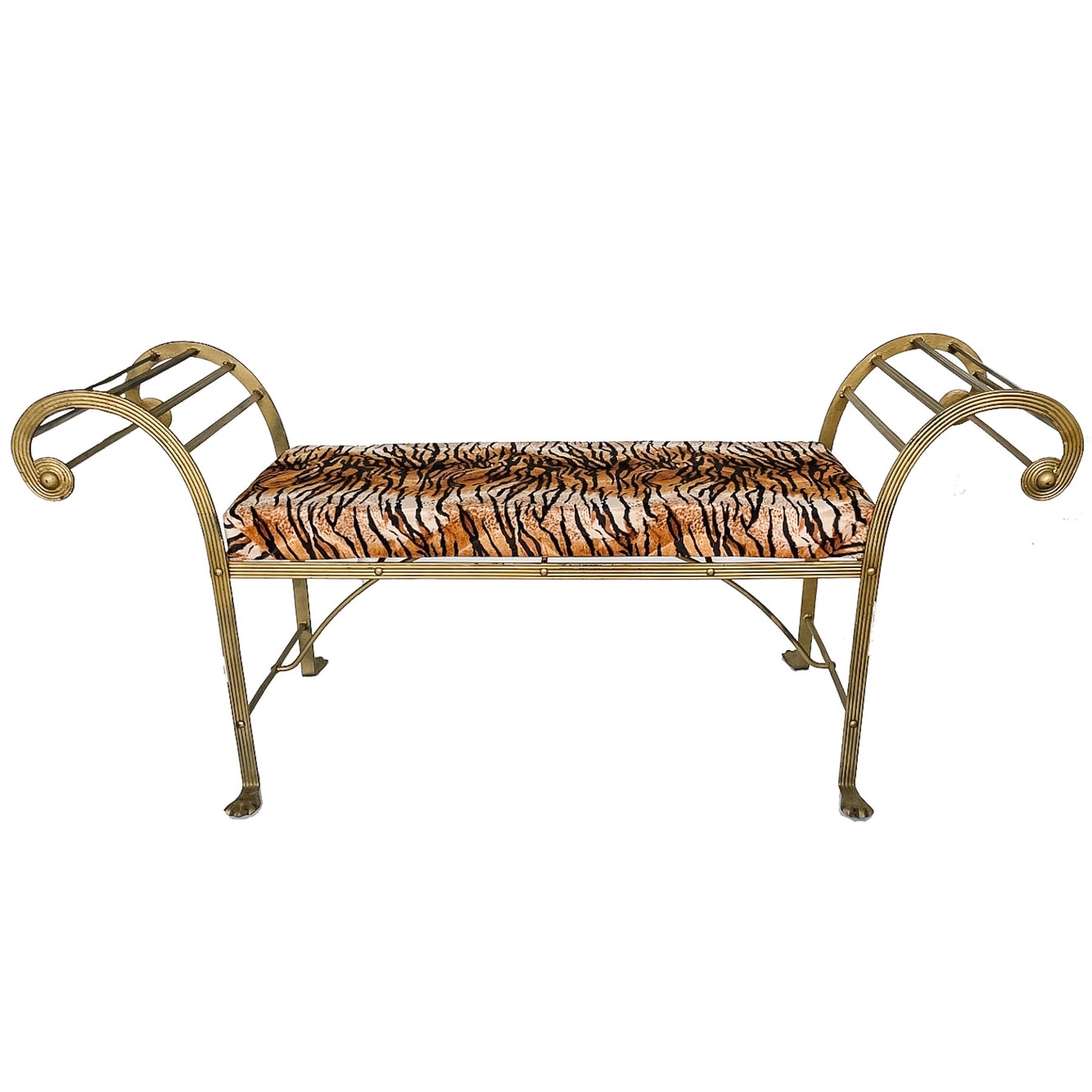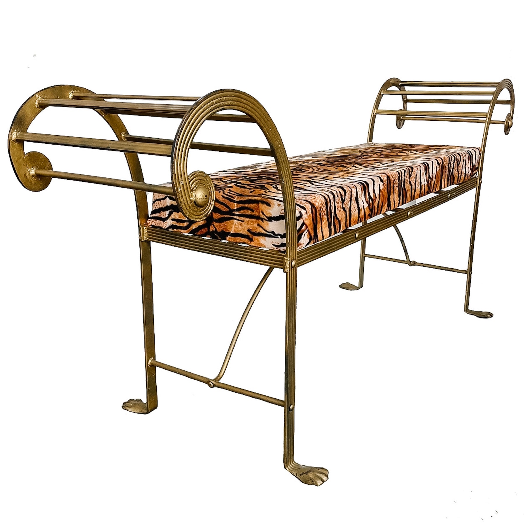 The bench features a sturdy wrought metal frame finished in an antiqued gold finish. The silhouette is defined by dramatic, scrolled pagoda-style arms and elegant fluted legs that terminate in detailed lion paw feet. The elongated seat has been updated with a plush tiger print upholstery, creating a high-contrast, "jungle chic" aesthetic that feels both vintage and contemporary. Given its narrow 15.5" depth, this is an ideal piece for a grand hallway, an entryway, or positioned at the foot of a king-sized bed. Newly reupholstered.