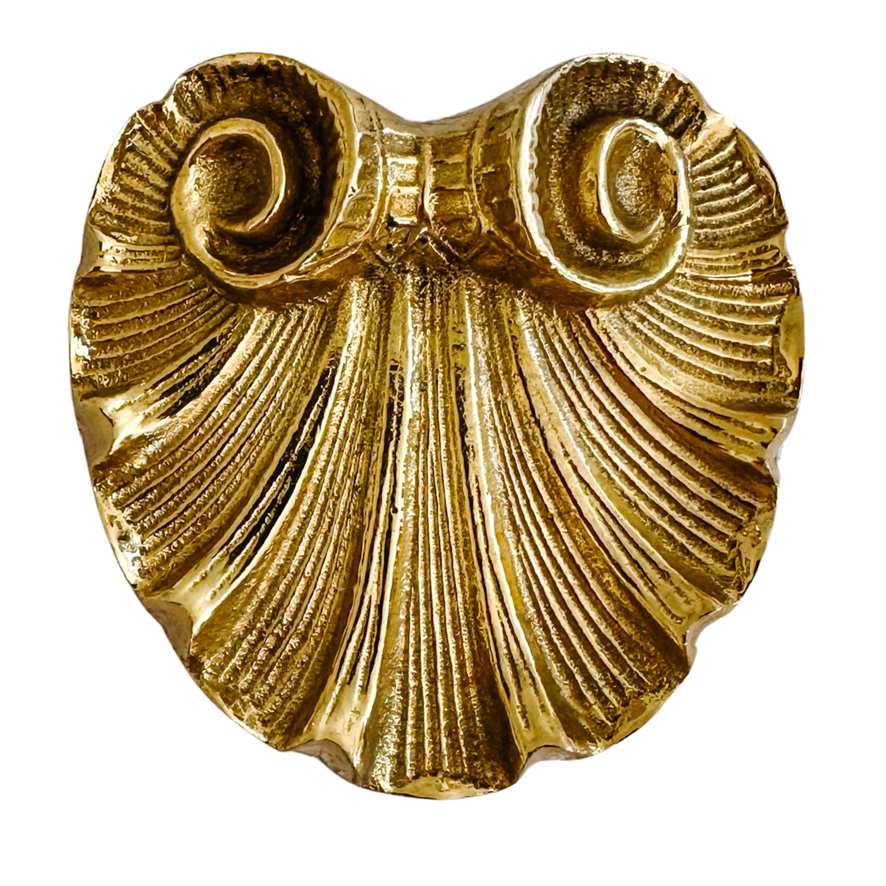 The intricate scallop shell design features deep, realistic fluting that beautifully catches the light, especially on the highly polished surface. The top of the shell is crowned with elegant, tightly wound volutes, adding a distinctive architectural detail often seen in classical design.