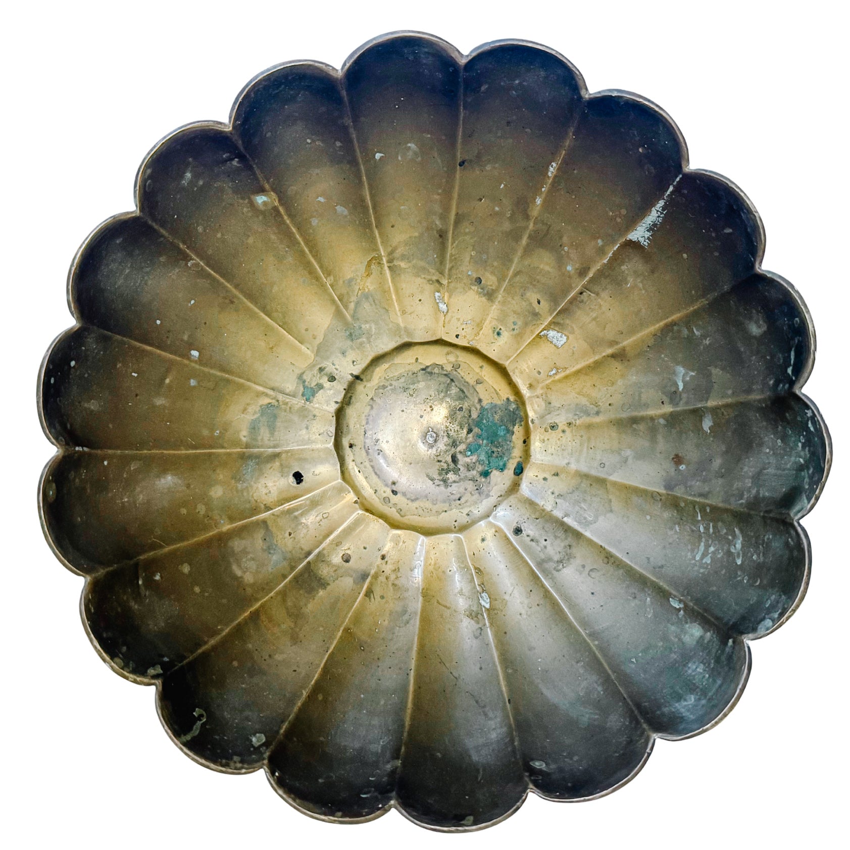 The warm, aged brass has developed a rich patina and slight verdigris (see interior photo), underscoring its age and history. The bowl can be lifted from the stand.