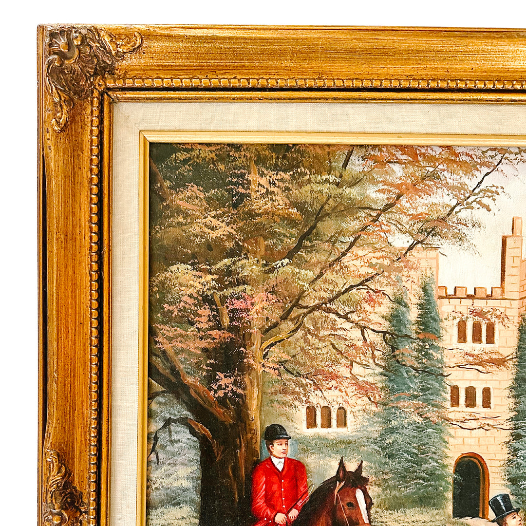 Oil on canvas of a traditional English fox hunt scene in front of an imposing English manor. In traditional manner, the painting features a pack of foxhounds and several riders wearing scarlet coats, white scarves, and black hats preparing for the chase.