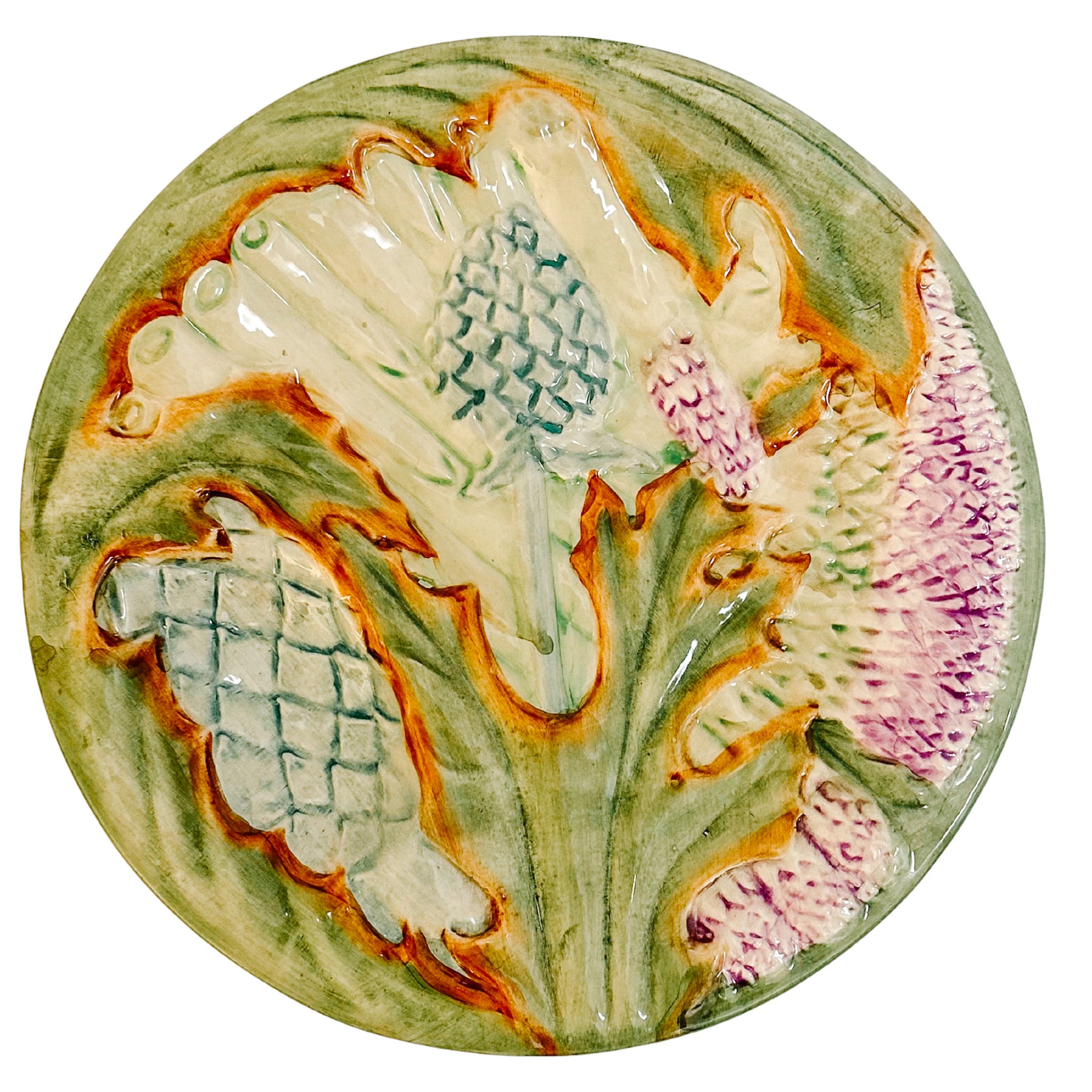 A French late 19th century barbotine / majolica asparagus and artichoke plate sourced in Paris. This plate features a vibrant, high-relief hand-decorated design of asparagus stalks and artichoke hearts, painted in rich, glossy glazes of vibrant green, creamy white, subtle purple, terracotta accents, and a deep sauce well for butter in the shape of an artichoke globe.