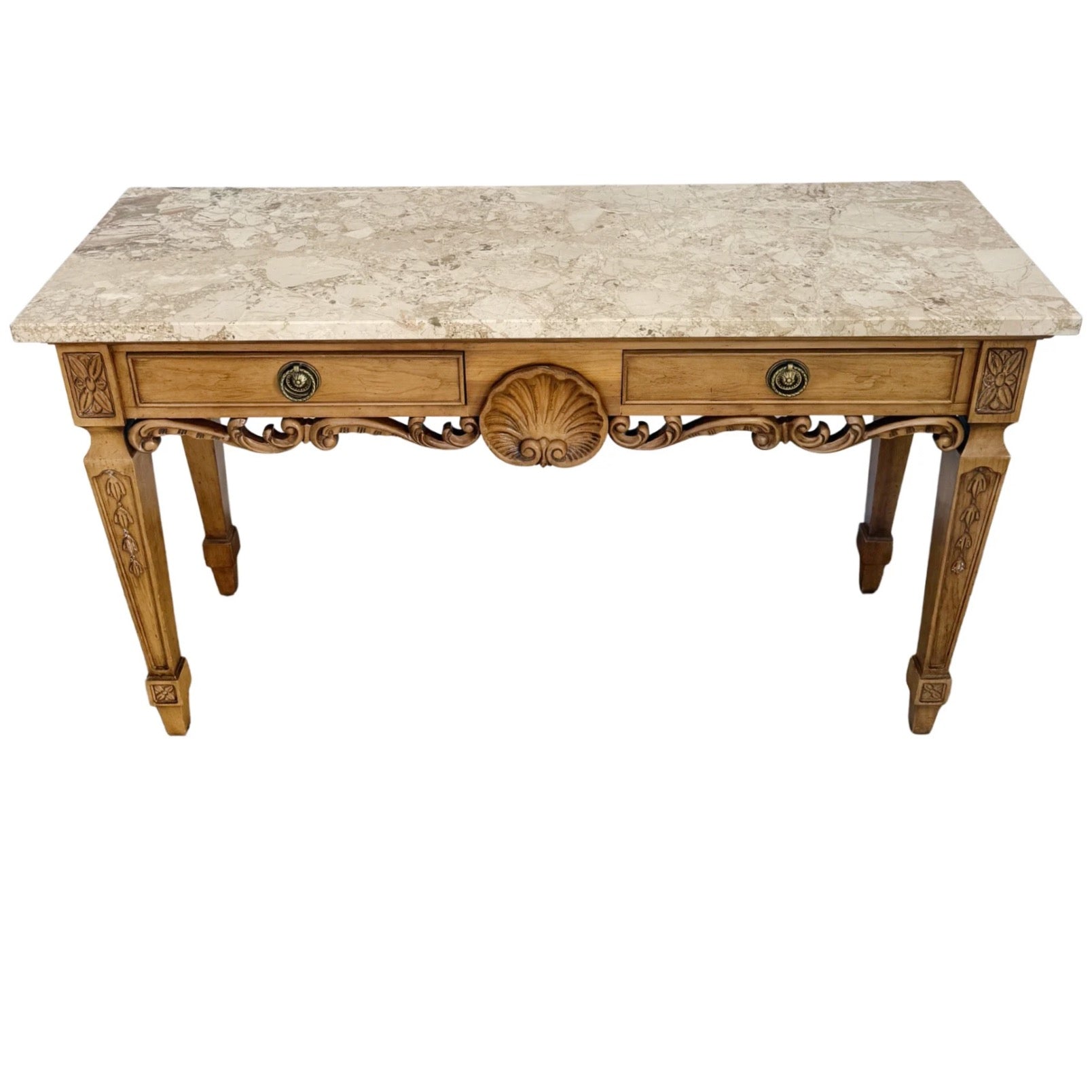 This elegant Neoclassical console table by Century Furniture features a thick, beveled "Genuine Marble" top made in Italy, showcasing a sophisticated palette of cream and tan veining. The wood frame is carved with a prominent center scallop shell motif and scrolling volutes along the apron. Two functional drawers are adorned with decorative brass ring pulls, while the tapered square legs feature carved bellflower swags and floral-accented corner blocks.