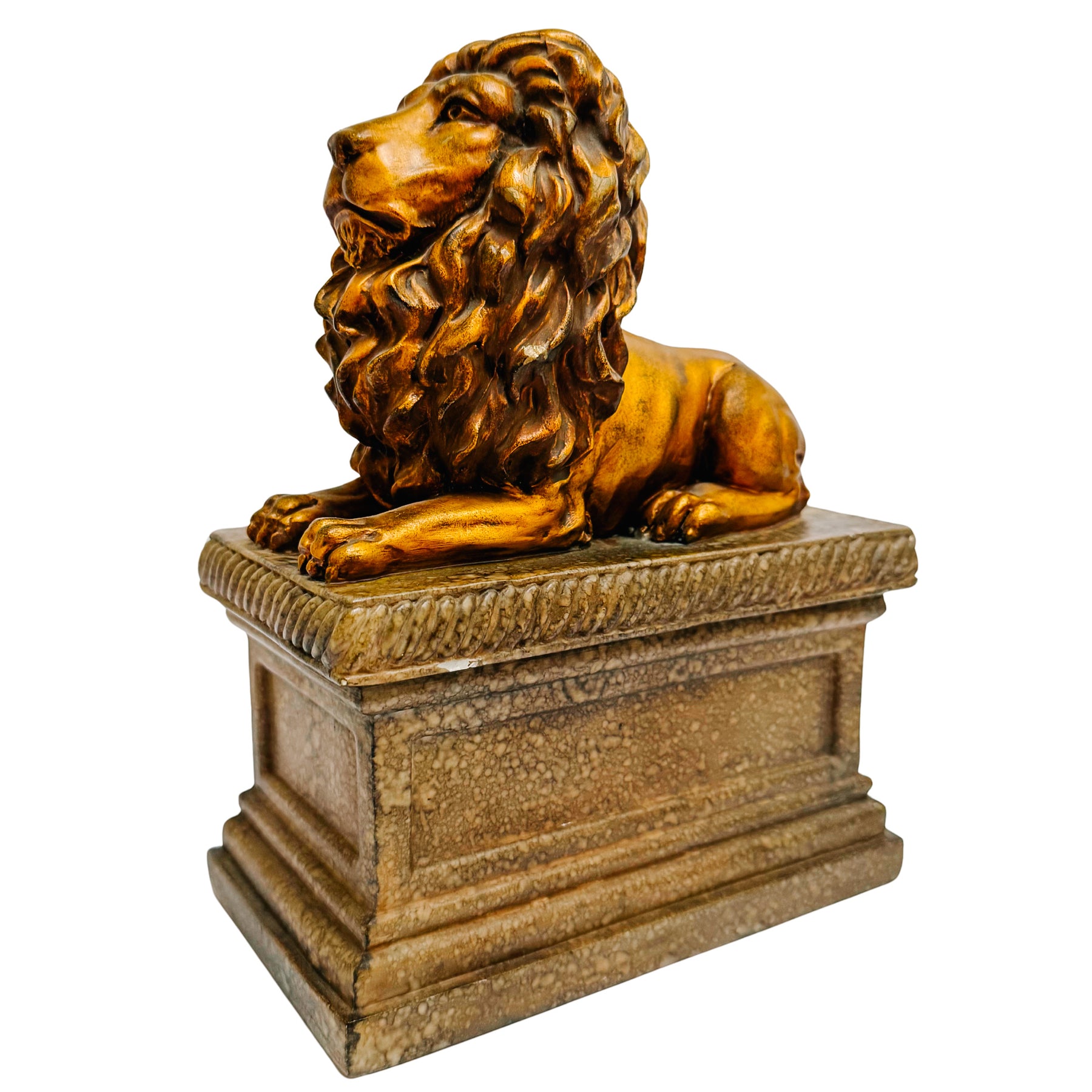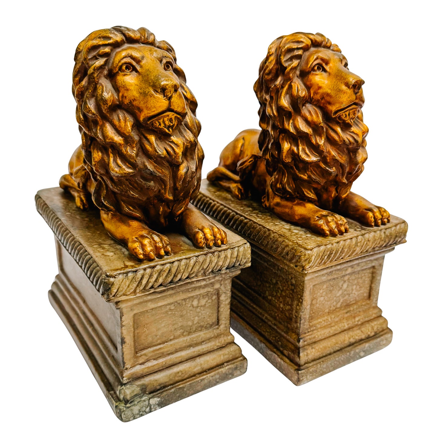 Add a touch of regal grandeur to your shelves with this impressive pair of vintage lion bookends. Crafted from resin with a rich gilt gold/bronze finish on the lions, these pieces are great for anchoring large, heavy books.